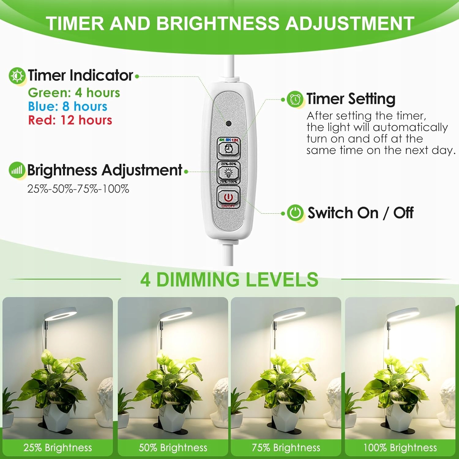 також оснащений 4 режимами яскравості освітлення для 25% -50% -75% -100%. Окрім забезпечення достатнього освітлення для рослин, вони запобігають опіках рослин і заощаджують енергію.