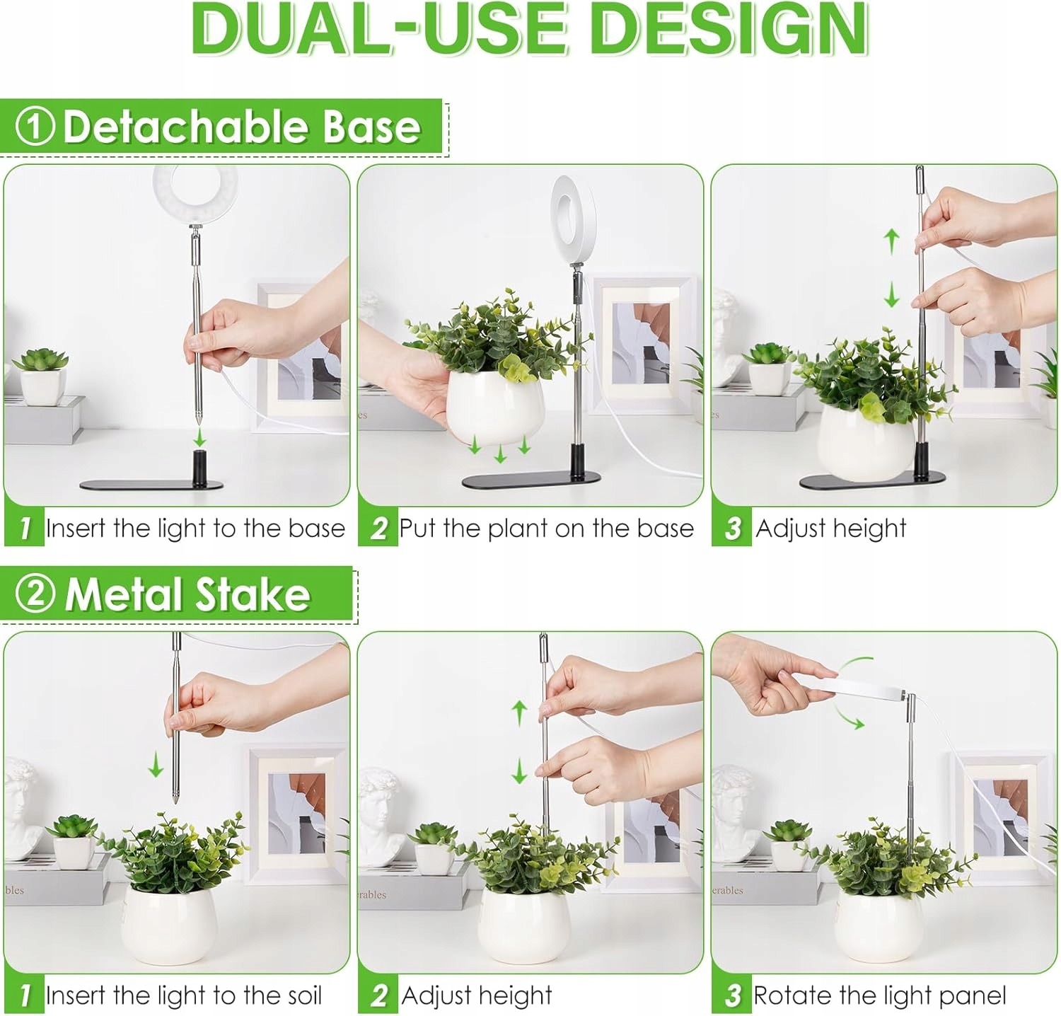 Світло для вирощування складається з 48 високоякісних світлодіодів, а його споживання енергії на 80% нижчий, ніж у випадку цибулин. Він випромінює світло повним спектром, який охоплює всі довжини хвилі від 380 нм до 780 нм, а також природне сонячне світло. Завдяки рівномірній яскравості, широкому спектру освітлення та м'якого світла, це ідеальне світло для росту для ваших рослин та прикраси будинку, що може захистити очі та зменшити втому очей. 4 Автоматичне включення та вимкнення відбуватиметься відповідно до попередніх налаштувань щодня одночасно.