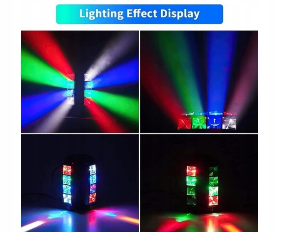 - Чотири режими керування: автоматичне шоу, з музикою (завдяки вбудованому мікрофону), DMX (з підключенням пристрою, що не входить в комплект поставки) або в Master/ Підлеглий режим (для синхронізації з багатьма центропістськими заходами). Ідеально підходить для бару, дискотеки, клубу, вечірки, ді-джея, танцювального залу тощо.