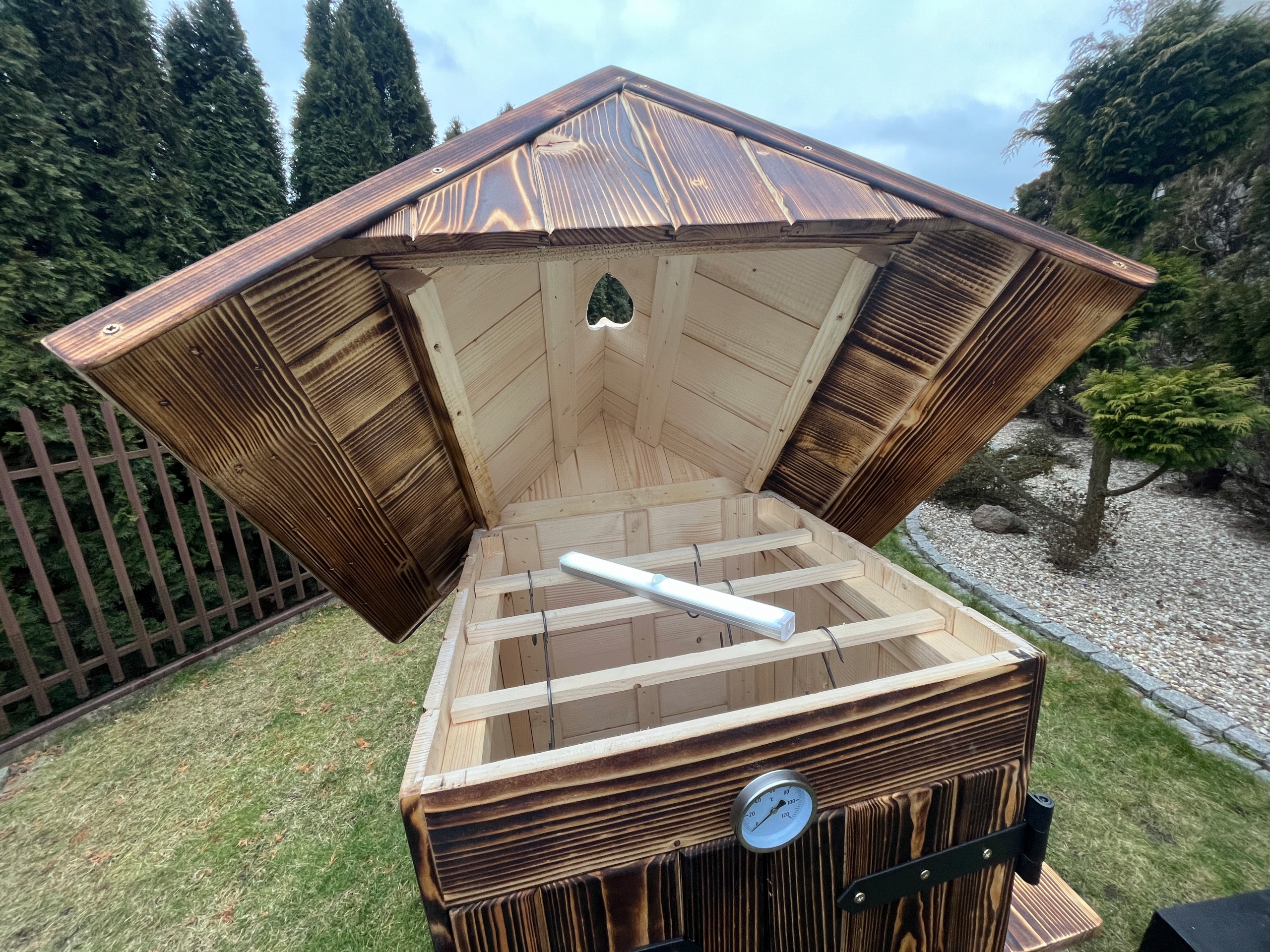 У двосхилим даху ми єдині, хто розміщує камін по центру посередині даху, що, безсумнівно, надає коптильні певного шарму та, як ми всі знаємо, що НАЙБІЛЬША циркуляція диму розташована на найвищому рівні, що дає нам найкращі результати під час копчення, і це те, що стосується приготування смачної нарізки, риби або сир.