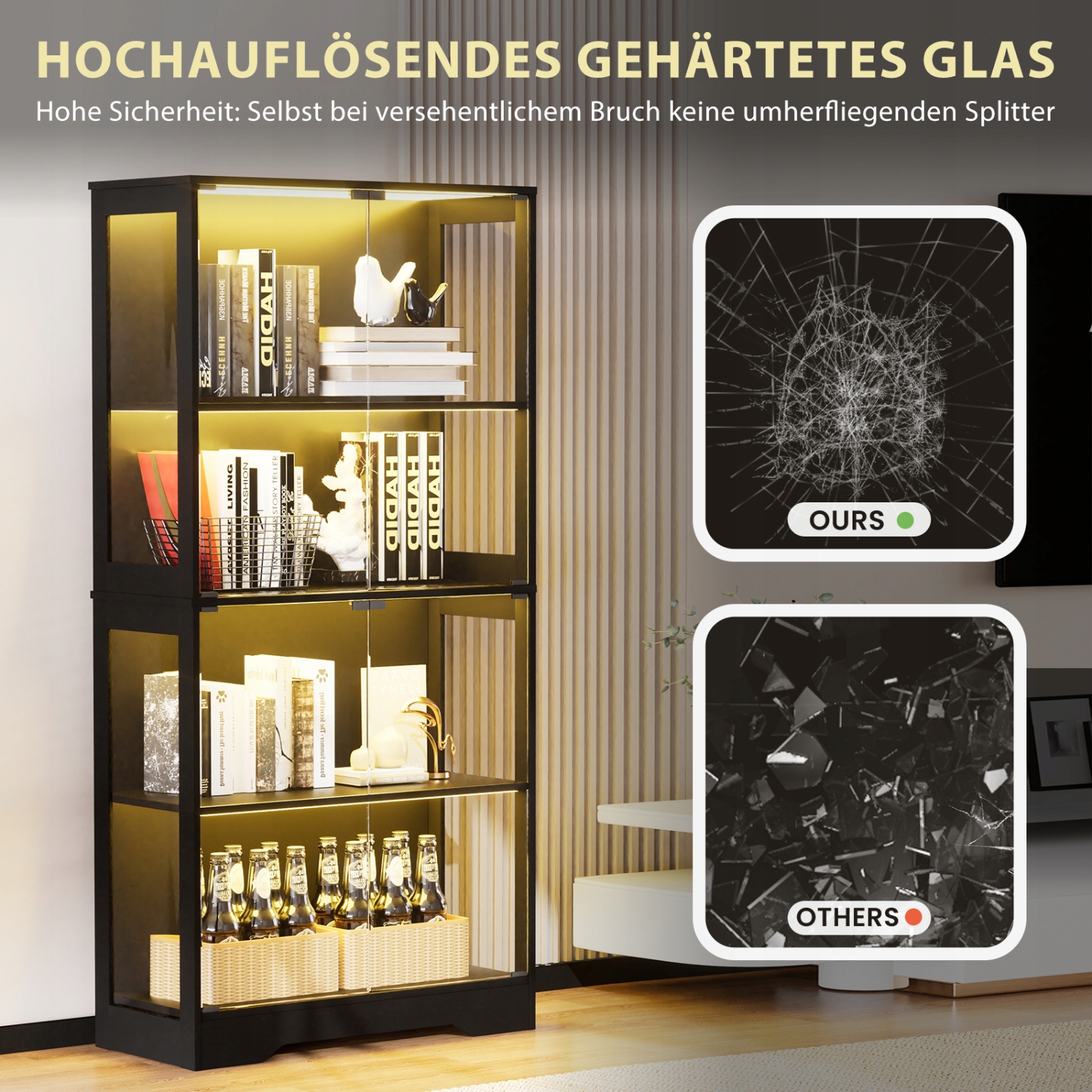 Надзвичайно велика місткість: ця скляна вітрина має розміри 80 см у ширину x 165 см у висоту x 35 см у глибину, що пропонує багато місця всередині. Завдяки чотирьом регульованим полицям він забезпечує гнучкий простір для зберігання предметів колекціонування, прикрас тощо, задовольняючи різноманітні потреби в демонстрації та зберіганні. Насолоджуйтесь чітким і організованим зберіганням.