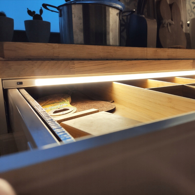 Завдяки вбудованому безконтактному перемикачу LED Освітлення вмикається одразу після відкриття шухляди та вимикається одразу після її закриття, що означає, що воно не витрачає енергію.
