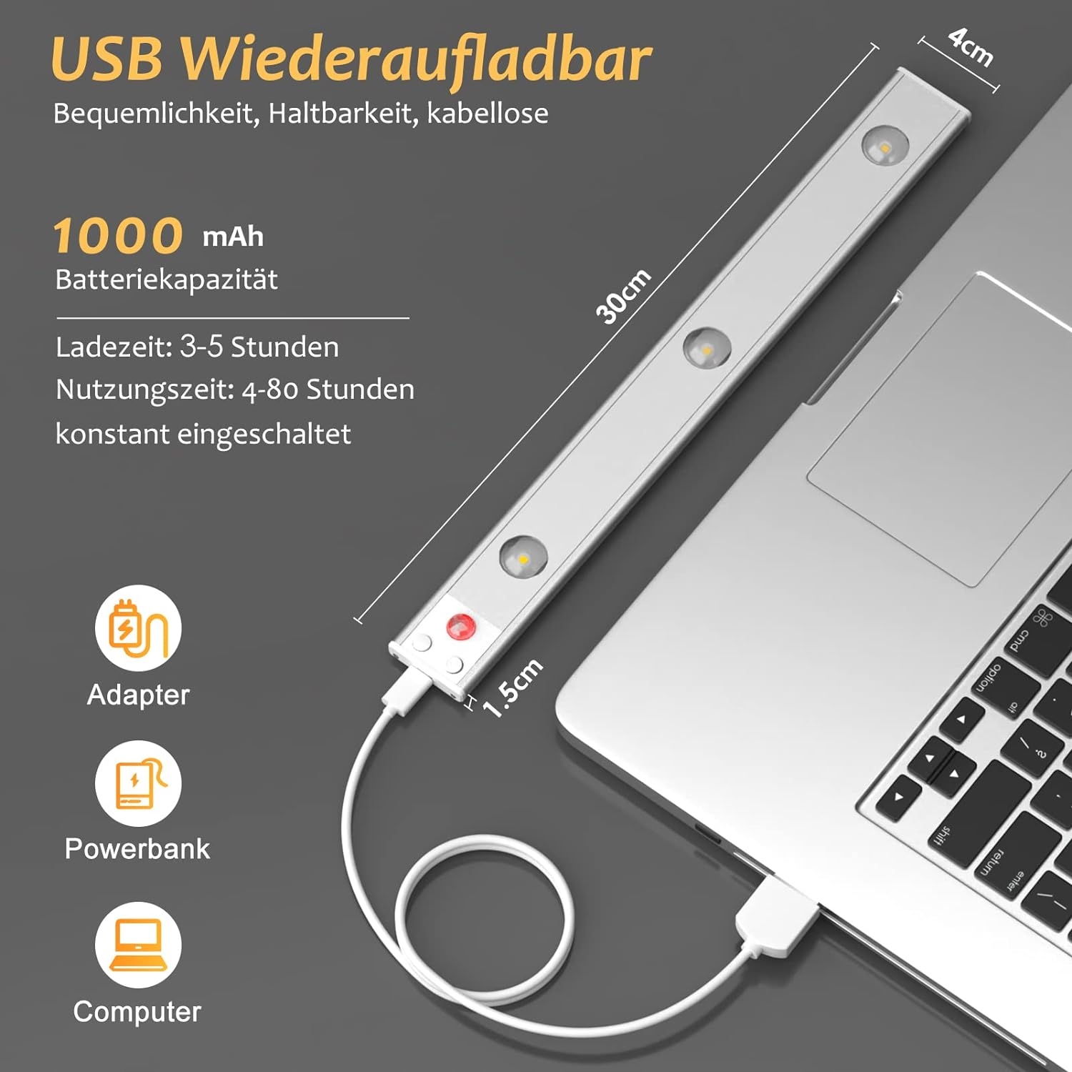 Бездротова світлодіодна акумуляторна лампа має вбудований акумулятор, який можна заряджати від будь-якого блоку живлення 5 В USB. Сенсорна лампа повністю заряджається через 3 години. У постійно включеному режимі протягом 5 годин (залежно від частоти використання та яскравості). Крім того, світлодіодне освітлення вимикається автоматично, якщо протягом 15 секунд не виявляється жодної активності в режимі нічного датчика, щоб заощадити енергію.