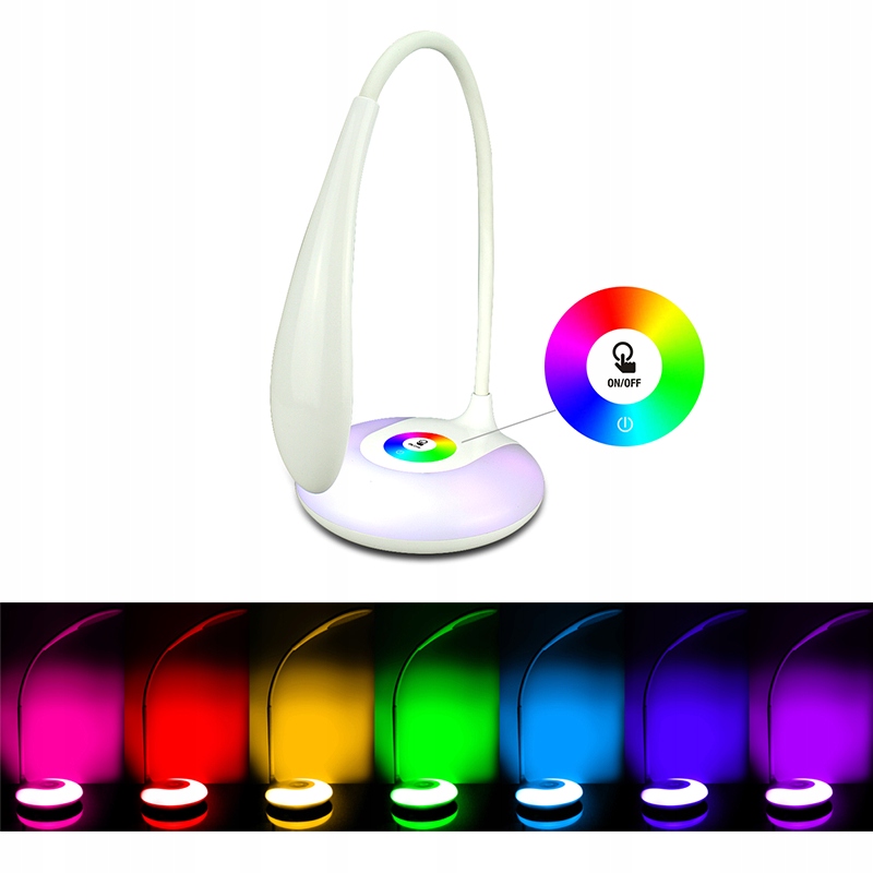 Сучасна модель настільної лампи з вбудованим світлодіодним підсвічуванням RGB. Має нову технологію, чутливу сенсорну панель, завдяки якій ви можете вибрати ідеальний колір підсвічування підставки під свій настрій! Верхні світлодіоди світильника світять яскравим білим світлом, схожим на денне, що не напружує зір. Завдяки рухливому кронштейну ви можете повертати його і встановлювати під будь-яким кутом. Спеціальний світлопом'якшувальний фільтр захистить ваші очі та зменшить відчуття втоми очей. Лампа не випромінює шкідливого УФ-випромінювання, тому безпечна для шкіри та очей. Лампа надзвичайно енергозберігаюча, живиться від зовнішнього джерела живлення USB.