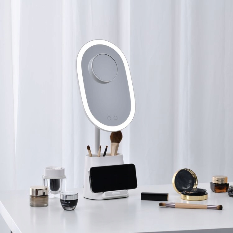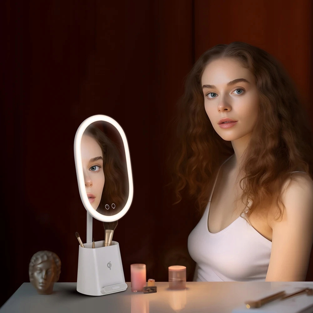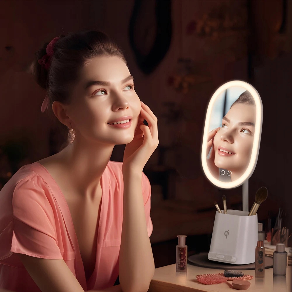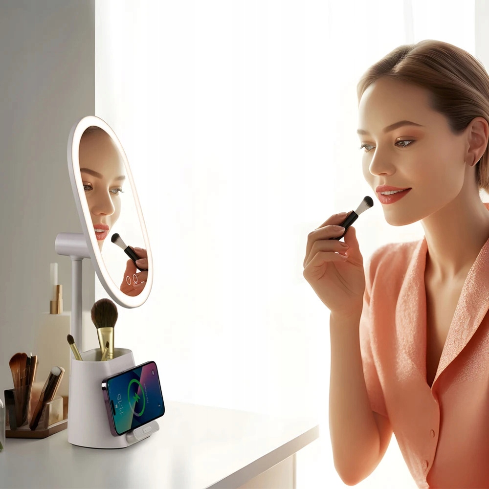 Світлодіодно освітлене косметичне дзеркало з 3 -кратним магістральцем та індукційним зарядним пристроєм qi 10w організатор