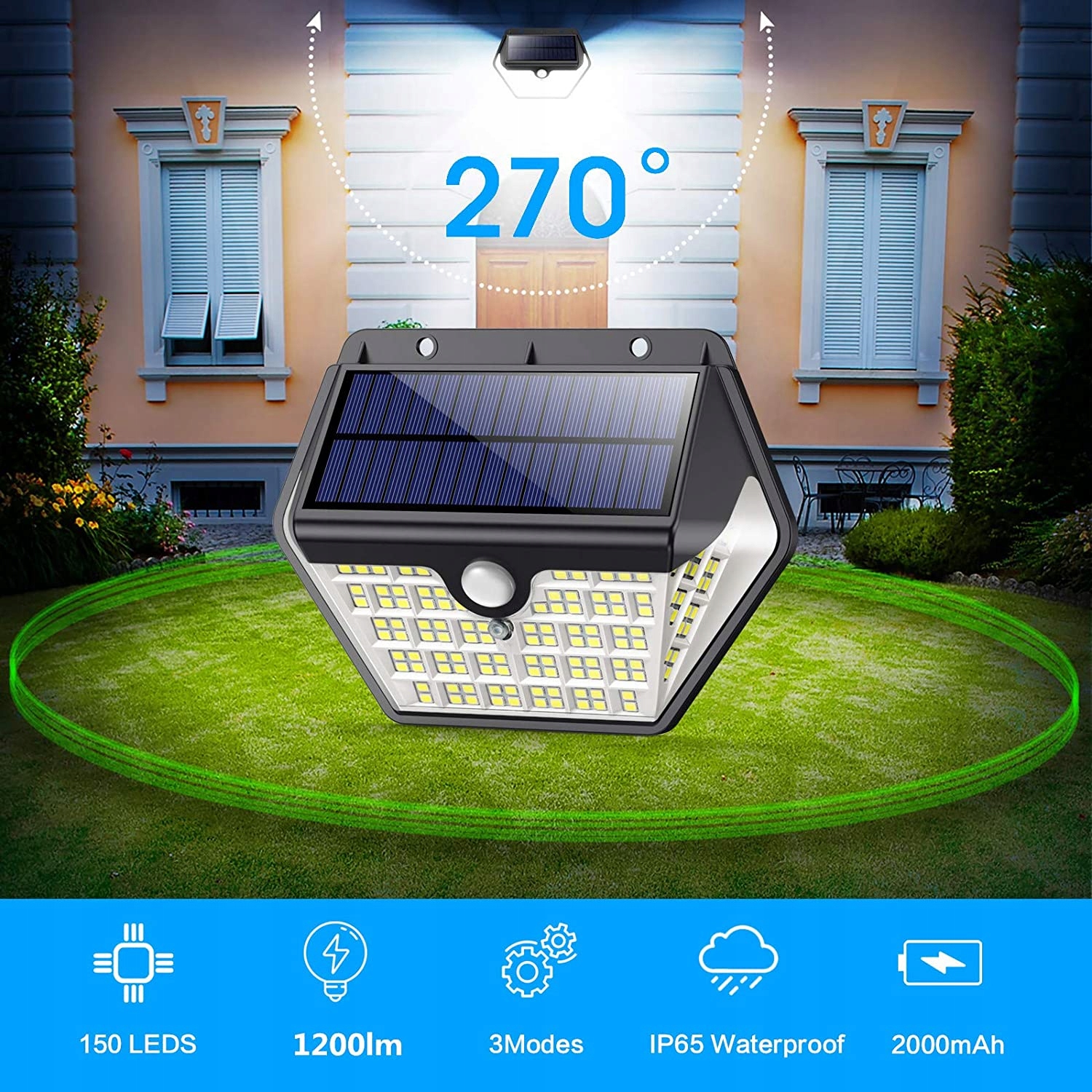 150 LED: оновлена версія 150 сонячних світлодіодів яскравіша за інші сонячні світильники на ринку, кут датчика руху 120º, чотиристороннє ширококутне освітлення 270°, сонячні лампи 1200 люмен можуть освітлювати ваш сад.