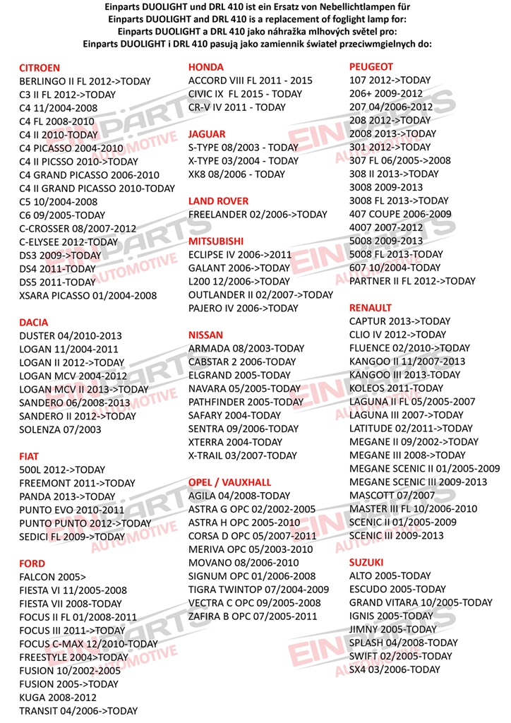 Модель EinParts DUOLIGHT оснащена тримачами, адаптованими до оригінальних кріплень протитуманних фар у популярних автомобілях (понад 100 моделей автомобілів!).