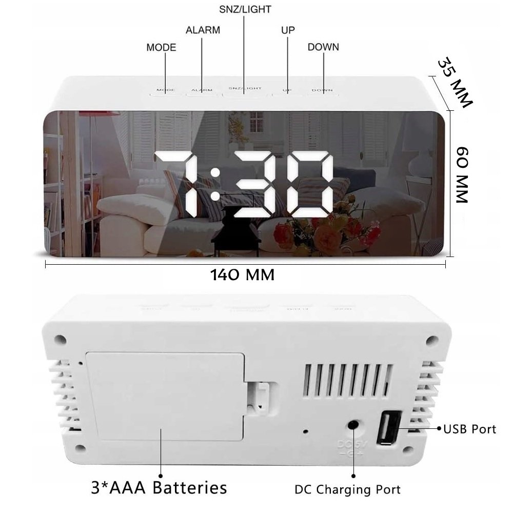 Естетичний цифровий годинник із дзеркальним покриттям стане ідеальним доповненням до спальні, офісу чи вітальні. Його цифри з підсвічуванням добре видно вдень, функція повторного будильника добре працює щодня, а елегантний блискучий циферблат чудово виглядає в будь-якому інтер’єрі.