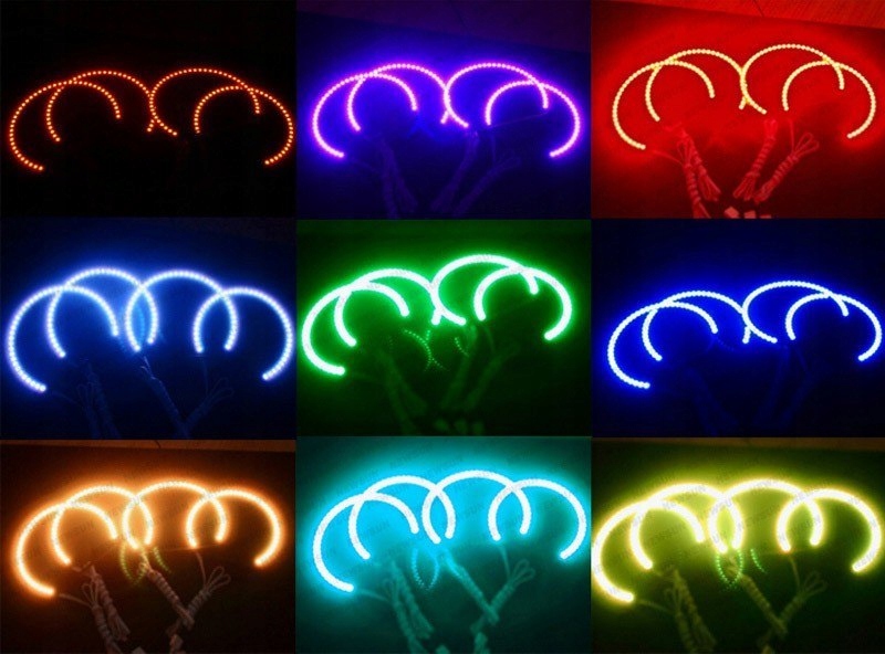 Набір з 4 світлодіодних кілець Angel Eyes RGB (для обох ліхтарів) - це сучасне рішення, яке повністю змінить зовнішній вигляд ваших автомобілів. Замість погано помітного і середнього на вигляд жовтого ви отримаєте барвисті SMD RGB кільця. Ми можемо вибрати (за допомогою пульта дистанційного керування) цілих 16 кольорів (включаючи холодний білий) і 4 режими освітлення (спалах, стробоскоп, згасання, плавне). Крім того, вся система дозволяє плавно регулювати яскравість і вмикати/вимикати також за допомогою пульта дистанційного керування.