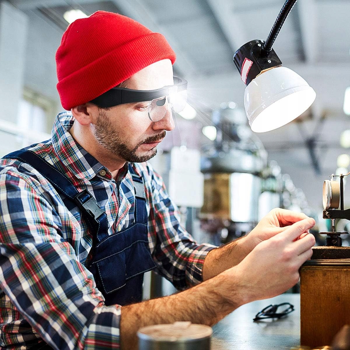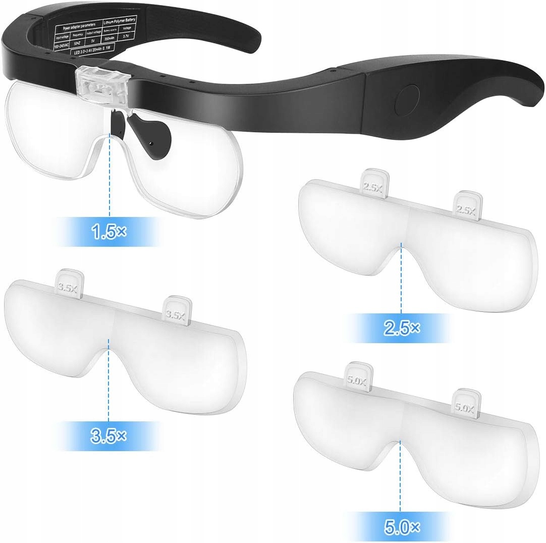 Збільшувальні окуляри E-More з 2 світлодіодами, 4 змінними лінзами (1,5X, 2,5X, 3,5X, 5X