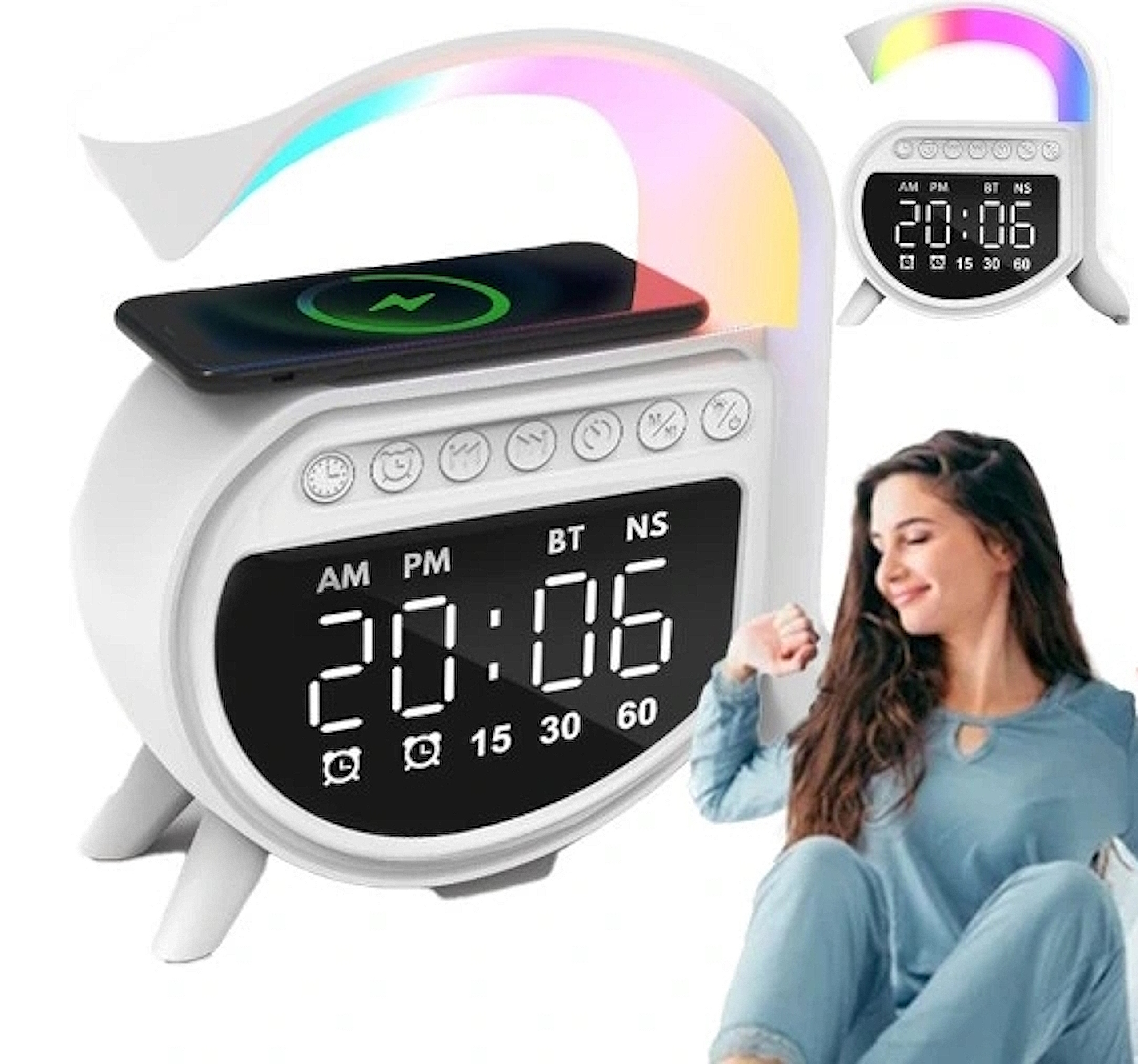 ✅ Функції: лампа, годинник, будильник, зарядний пристрій Qi, динамік, FM Radio,