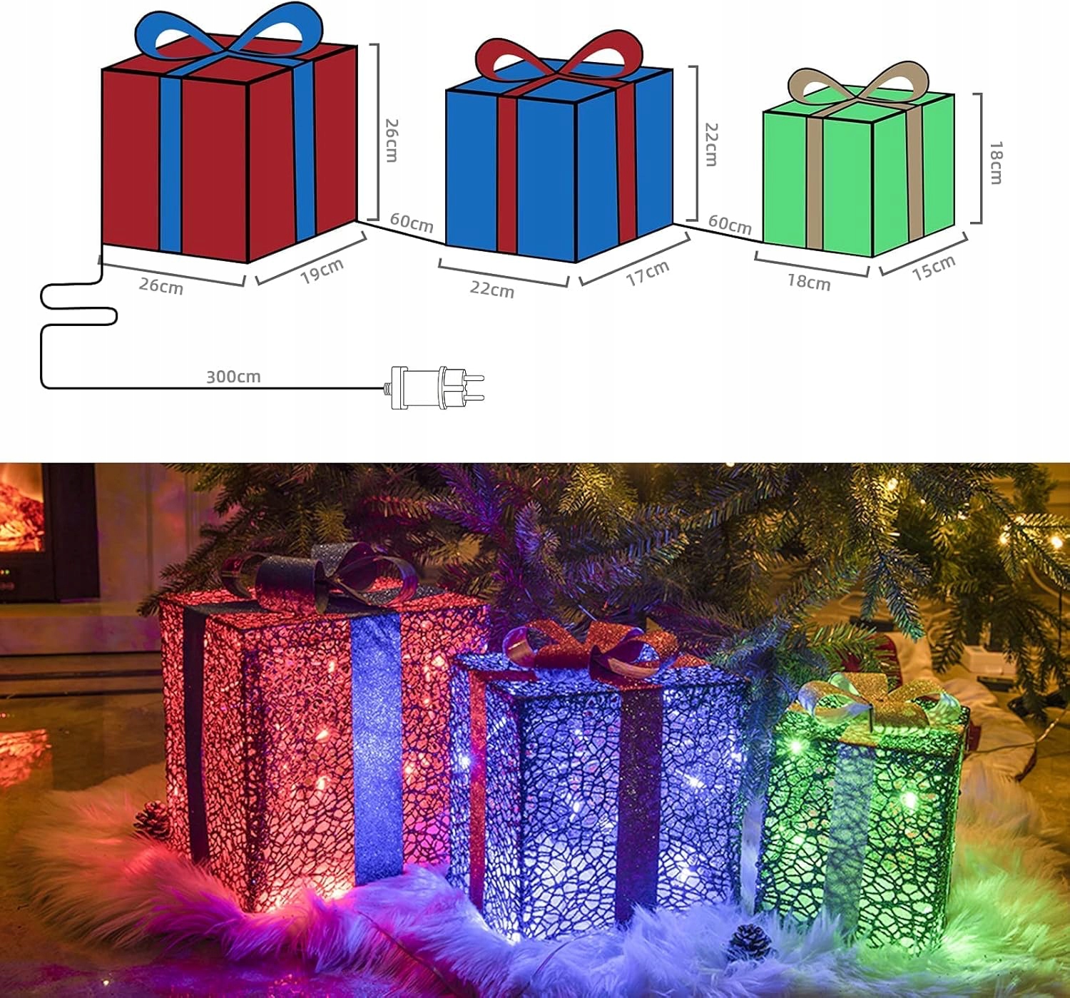 Різдвяні коробки: 3 подарункові коробки на Різдво, з луками. Велика червона коробка, середній синій ящик, маленька зелена коробка. Всього 48 діодів у теплому білому кольорі забезпечують чудову атмосферу Різдва.