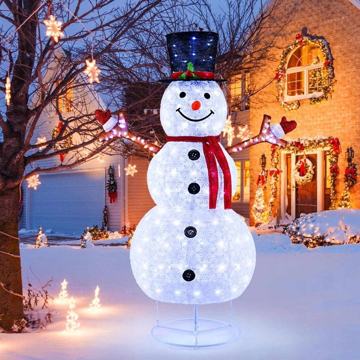 Чарівна різдвяна прикраса: Сніговий сніговик носить чорний капелюх і довгий червоний шарф, щоб принести різдвяну радість сусідам та перехожим. У сніговика також є руки з гілки з рукавичками, завдяки яким він ідеально поєднується з зимовим оточенням.