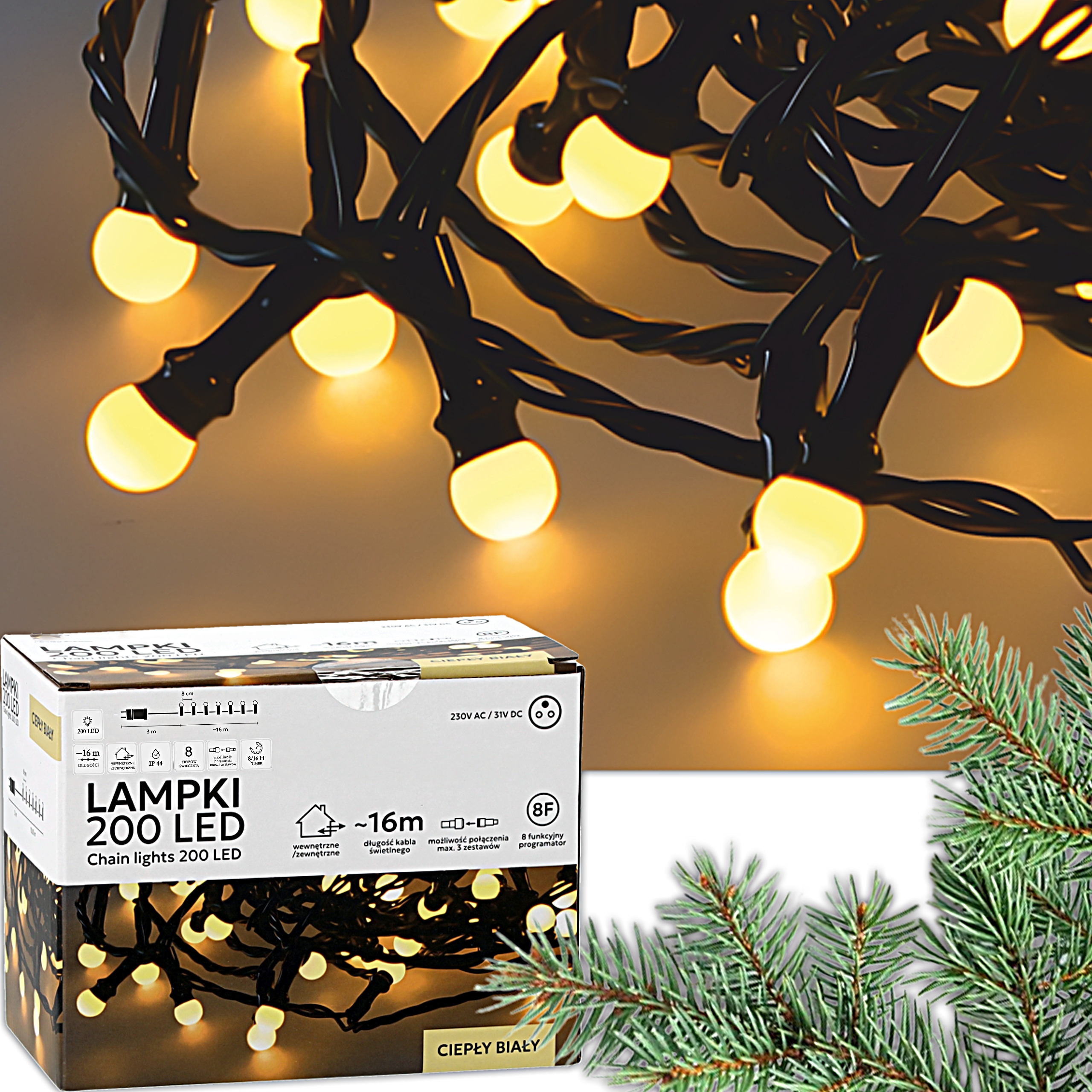 Світлодіодний ланцюжок з 200 діодами теплого білого кольору, розміщеними в кулях діаметром 1 см, - це елегантна прикраса, яка чудово підійде на ялинку, терасу, балкон або вітальня. Загальна довжина 19 м (включаючи 16 м освітлювальної частини) робить лампи ідеальними як для менших, так і для великих композицій.