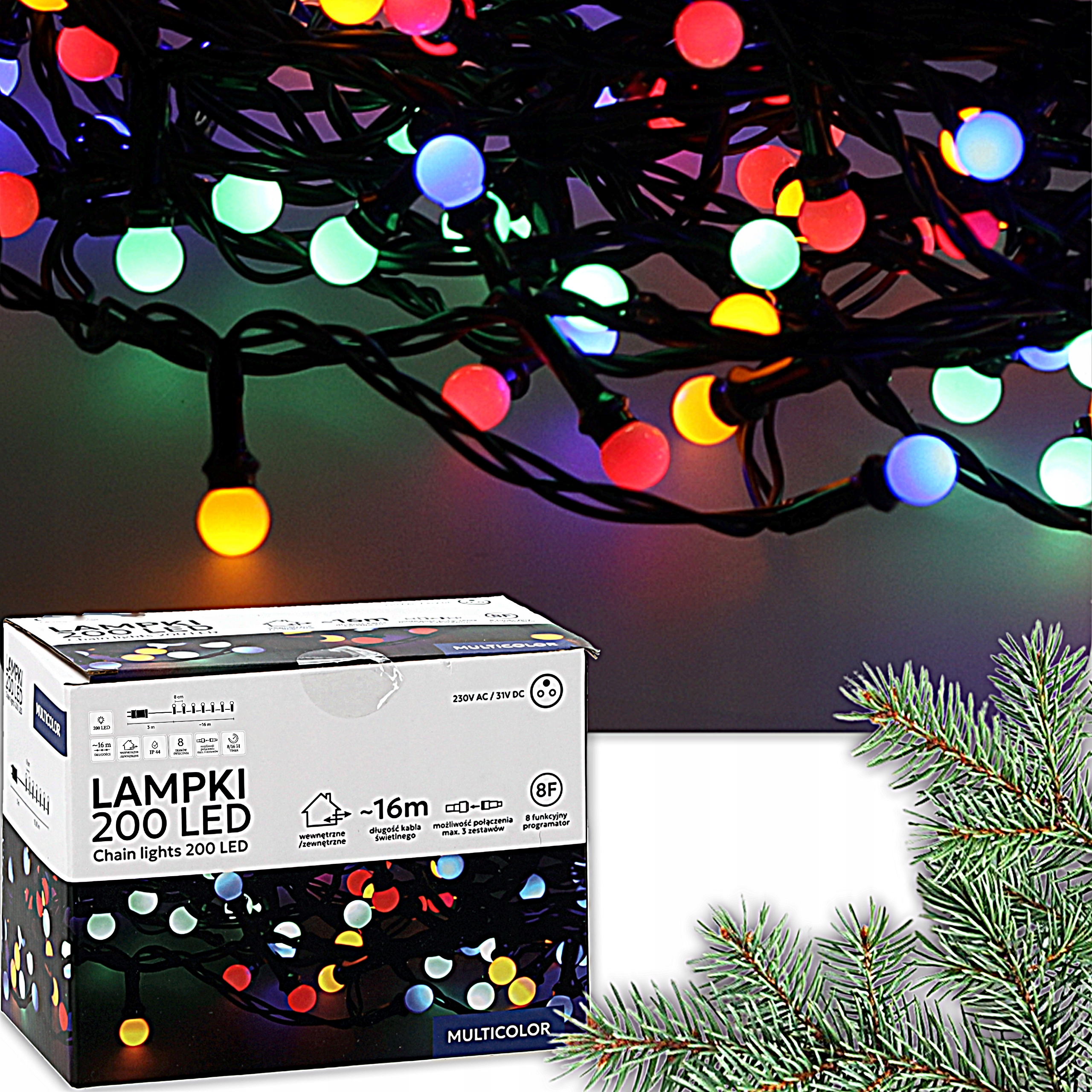 СВІТЛОДІОДНІ РІЗДВЯНІ СВІТЛІ ВІДКРИТТЯ ВНУТРИ 200 СВІТЛІВ 8 ФУНКЦІЙ 16+3 М