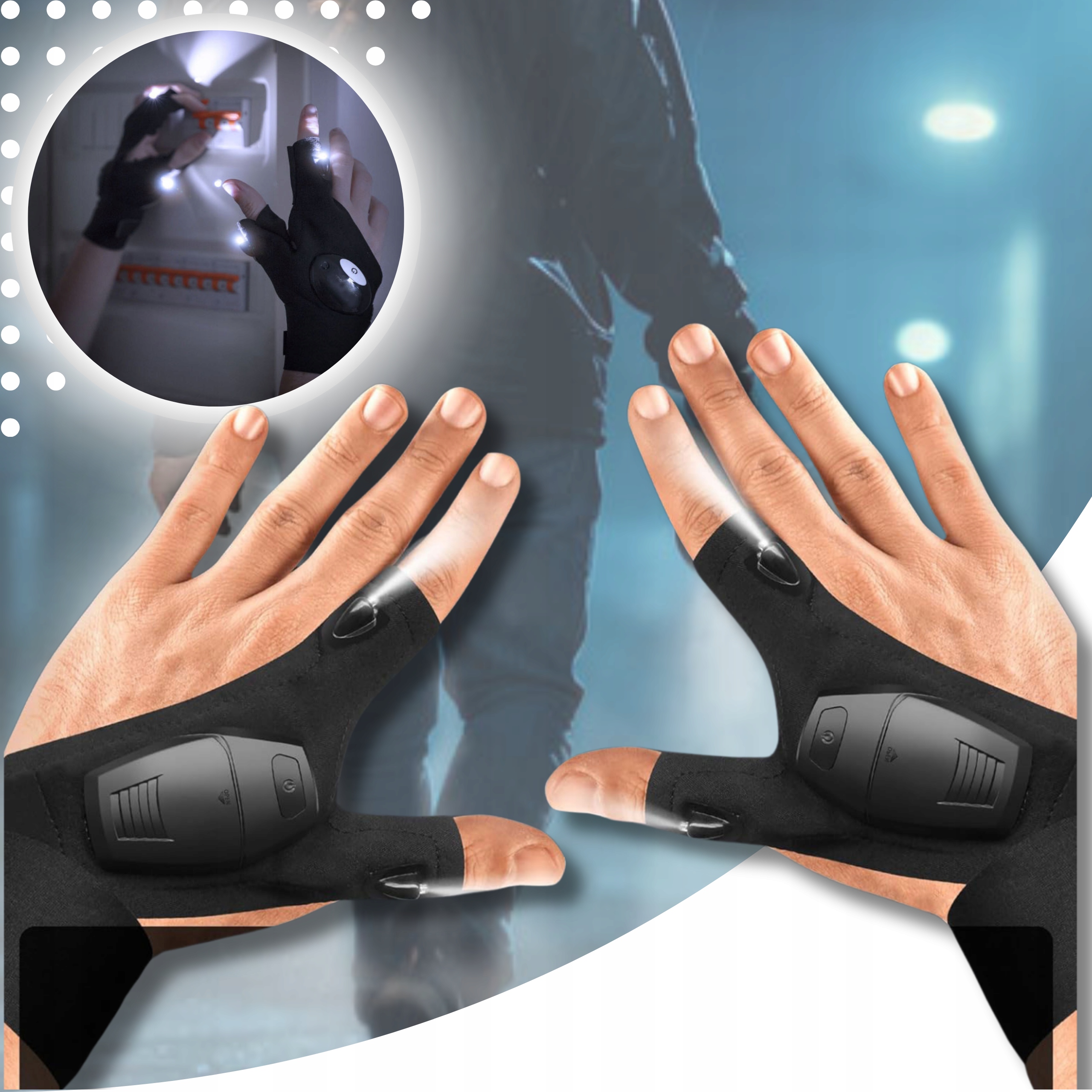 Рукавички оснащені 4 білими світлодіодами (2 на кожній рукавичці), що дозволяє освітлювати робочу поверхню без використання рук.