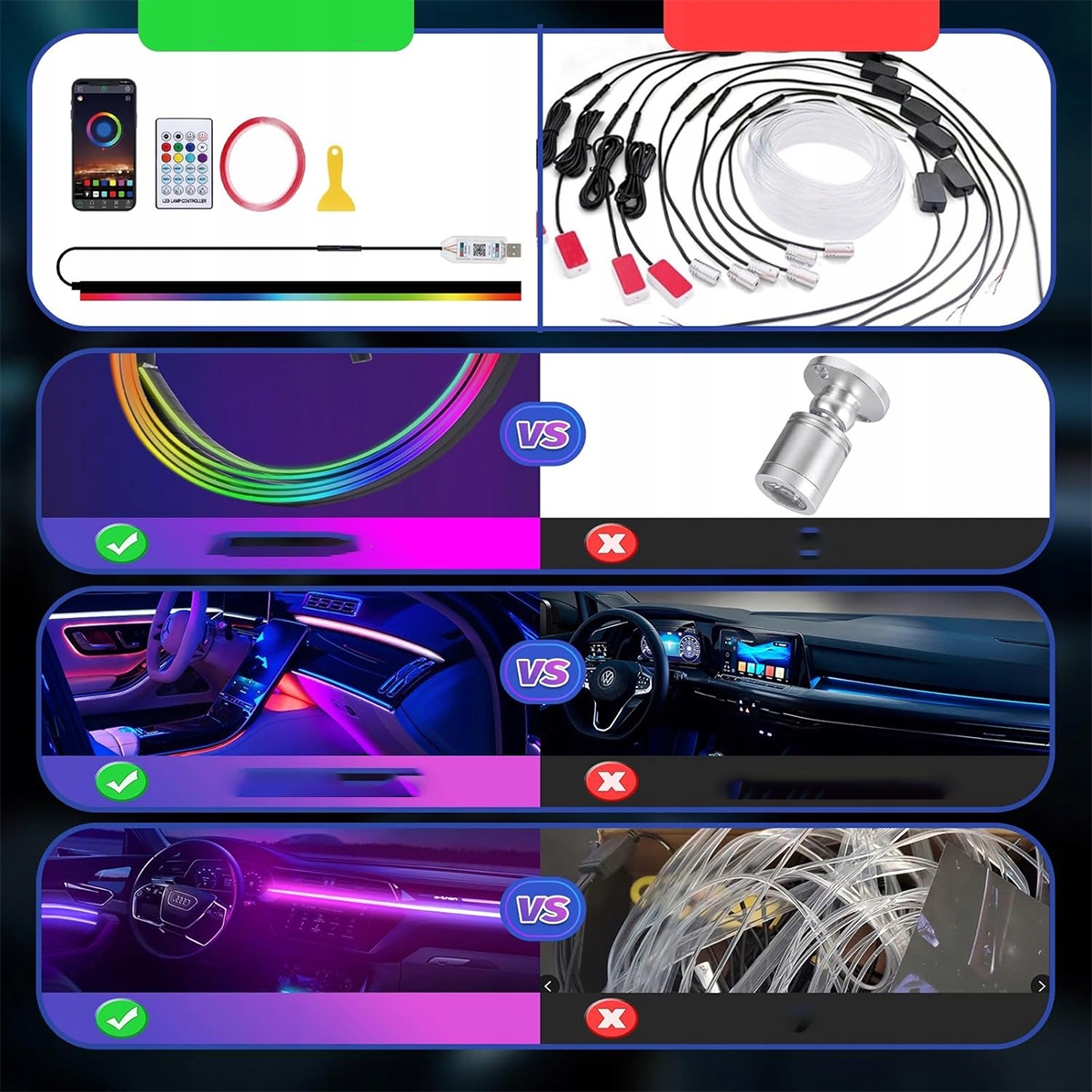 ✴️【Акрилові світлодіодні автомобільні ліхтарі】Останній дизайн акрилових світлодіодних ліхтарів салону автомобіля та волоконно-оптичних ліхтарів у порівнянні з вбудованими 146 світлодіодними автомобільними аксесуарами забезпечують яскраве світло та яскраві кольори, ніж 1 світлодіодне волоконно-оптичне світло, вони яскравіші, рівномірніші та делікатніші.