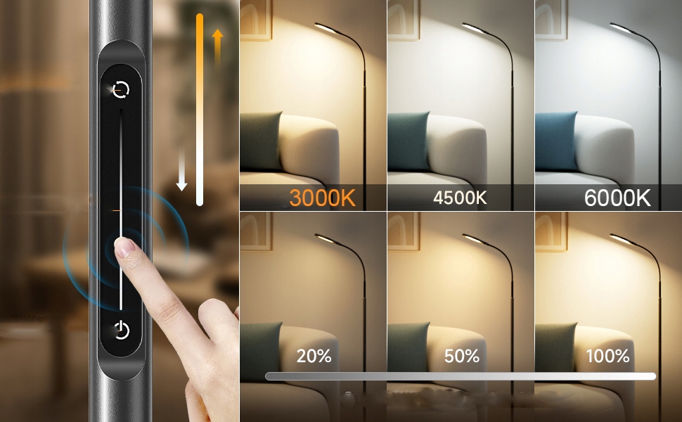 - Лампа для підлоги має 3 правил кольорової температури, прохолодний білий, теплий білий і нейтральний білий, а яскравість може регулюватися постійно.