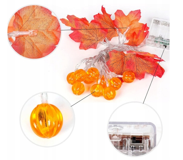- Світлодіодні ліхтарі Maple + гарбузи - ідеальний елемент прикраси вашої квартири під час Хеллоуїна. Надзвичайно ефективні світильники дадуть кімнаті дивовижний, унікальний настрій. Вони були виготовлені з високоякісних світлодіодів, які є джерелом сильного, інтенсивного світла, розміщеного на стриманому срібному дроті. Завдяки своїй структурі її можна сформувати в будь -яку форму. Продукт також буде працювати в прикрасах Windows Shop або під час організації заходів, не тільки під час Хеллоуїна.
