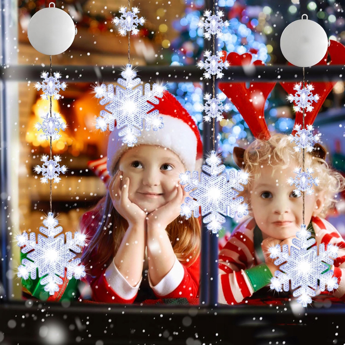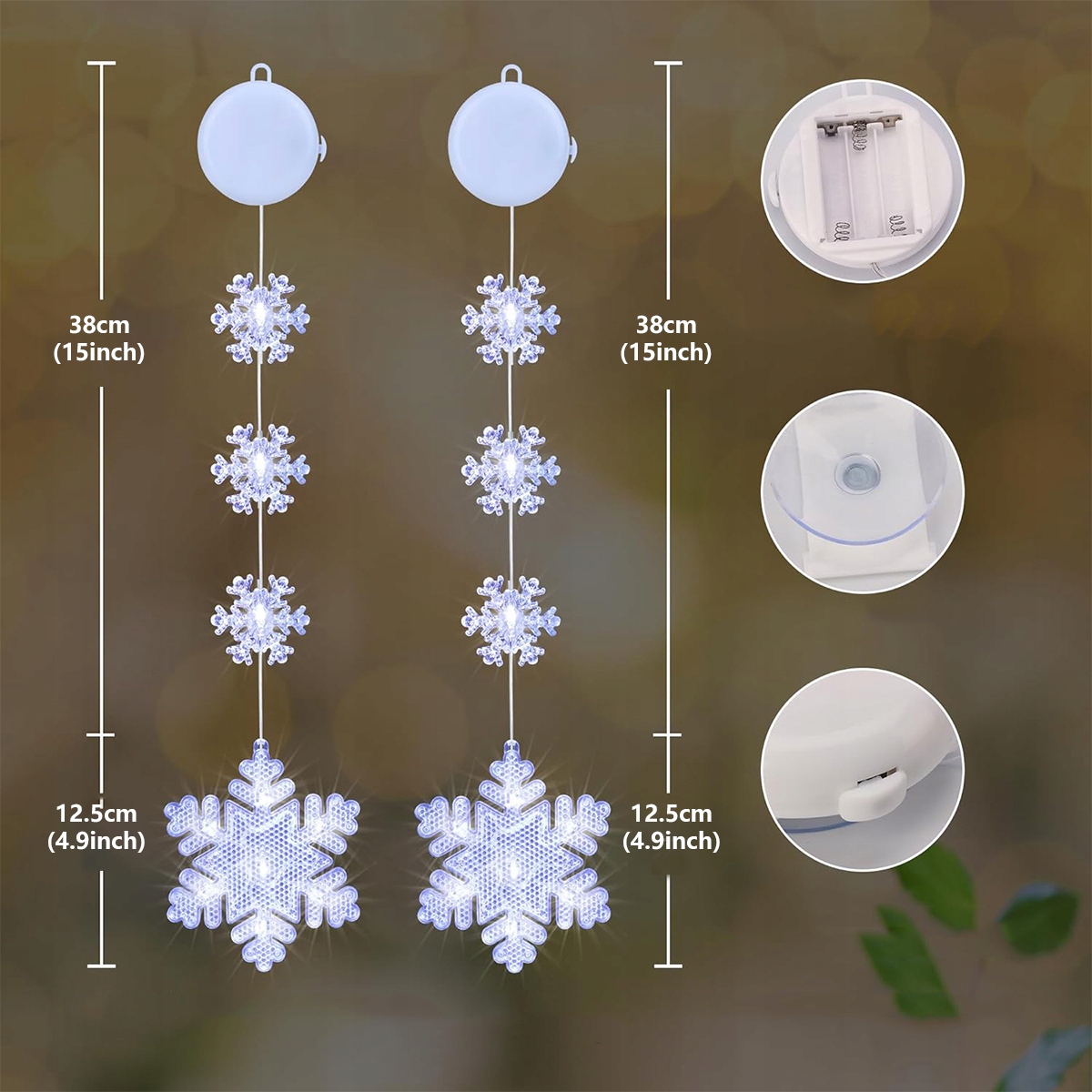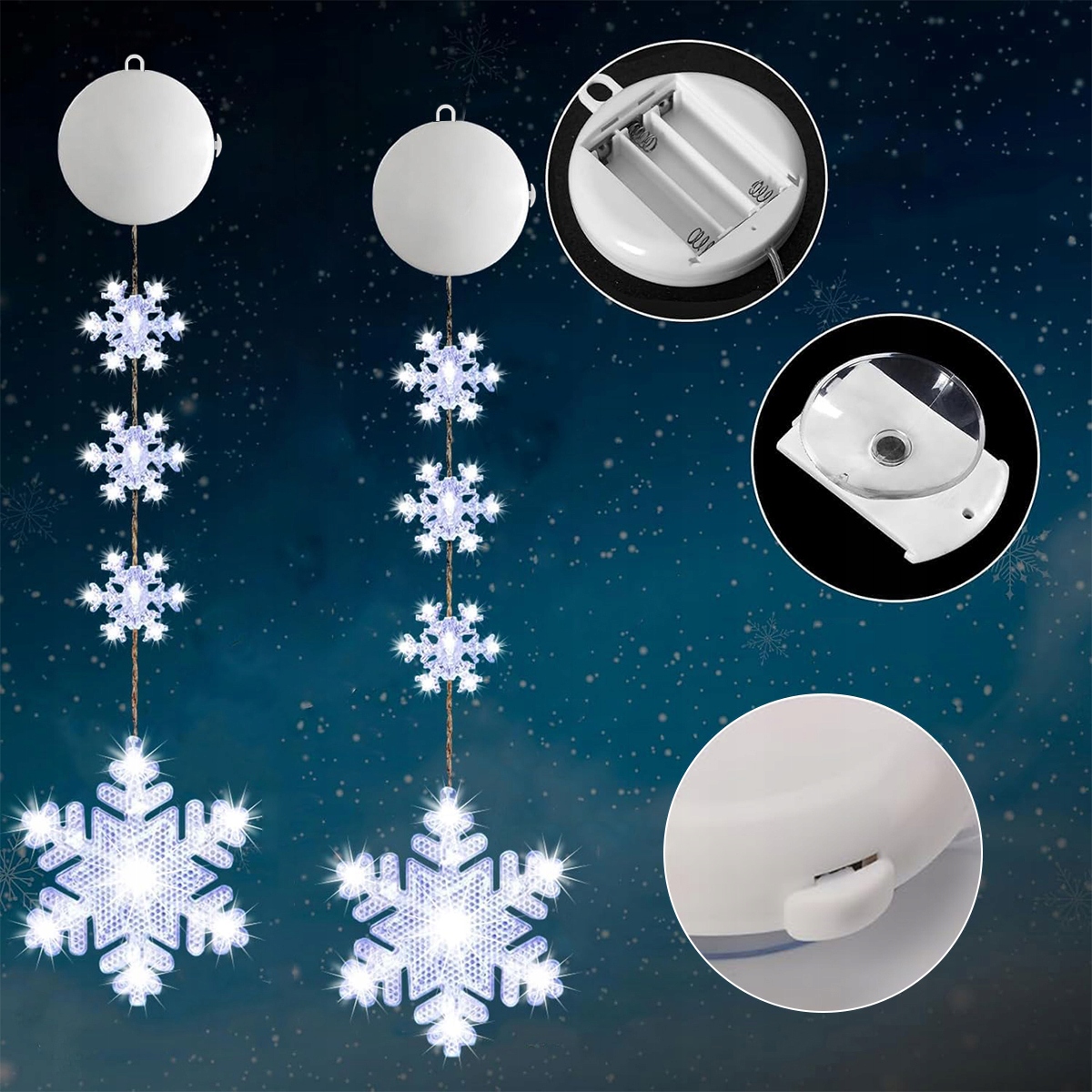 Ця прикраса для вікон у формі сніжинки складається з великої сніжинки та трьох маленьких сніжинок, включаючи 10 прохолодних білих світлодіодних ліхтарів, кожна нитка має міцну присоску та клейкий гачок, її можна легко повісити на будь-яку гладку поверхню.