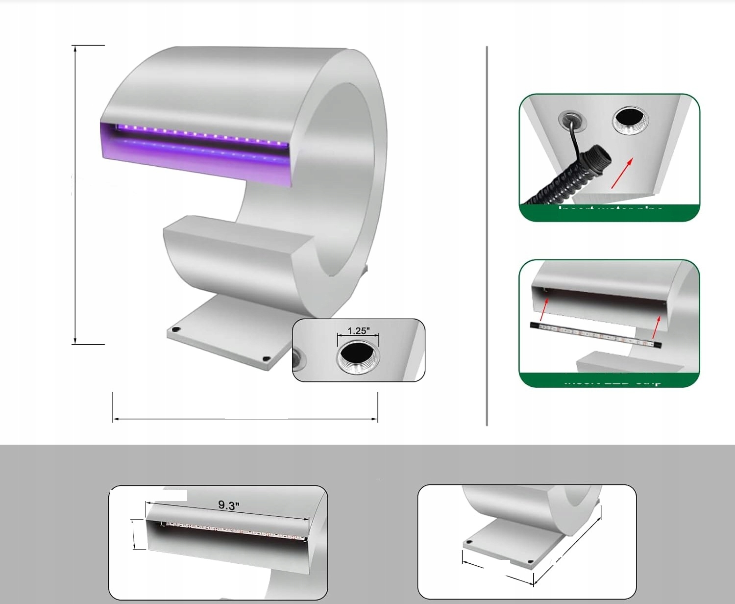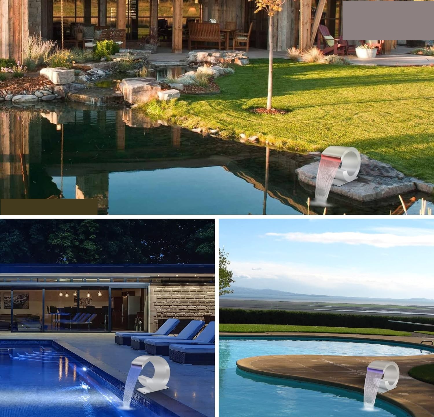 - водоспад з нержавіючої сталі- Основна частина водоспаду затоку встановлена з 304 нержавіючої сталі, що забезпечує більшу стабільність та довговічність під час тривалого використання. Дизайн відкритого краю створює елегантний, освіжаючий і вільно падаючи водні ефекти у вашому басейні чи ставку.