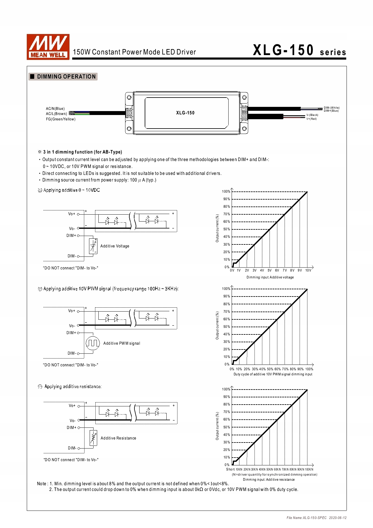 - Сертифікати безпеки: UL8750 (тип "HL" ), UL879, CSA C22.2 No. 250.13-12; ENEC EN61347-1, EN61347-2-13 незалежно, EN62384; GB19510.1,GB19510.14; EAC TP TC 004; J61347-1(H29), J61347-2-13(H29),KC61347-1,KC61347-2-13,IS15885(Part2/Sec13)(лише для типу XLG-150I); NOM-058-SCFI-2017
