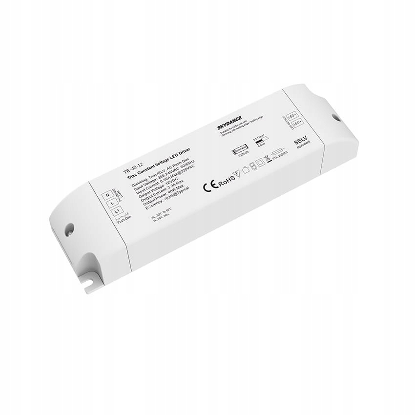 TE-40-12 — це світлодіодний блок живлення постійної напруги 40 Вт із вихідною напругою 12 В постійного струму, який регулюється за допомогою симисторного диммера або миттєвої кнопки (PUSH). Максимальний вихідний струм блоку живлення становить 3,34 А. Цей блок живлення має вбудований захист від перевантаження, короткого замикання та перегріву. Призначений для регулювання яскравості монохроматичного освітлення, наприклад, однокольорових світлодіодних стрічок.