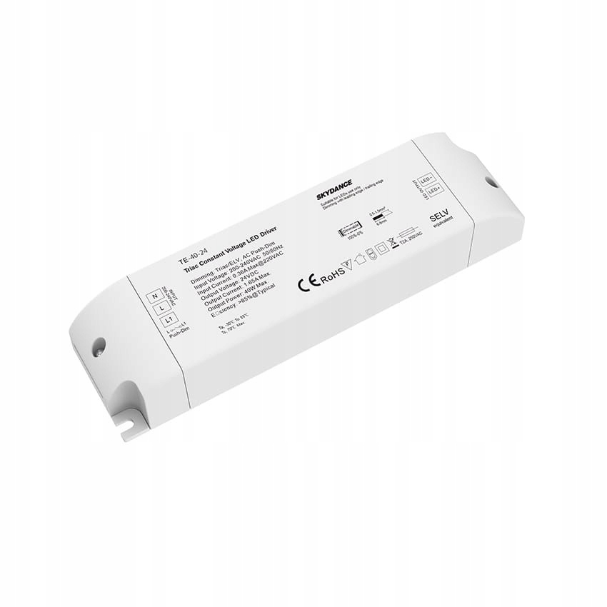 TE-40-24 — це світлодіодне джерело живлення постійної напруги 40 Вт із вихідною напругою 24 В постійного струму, призначене для роботи з диммером симистора або миттєвою кнопкою (PUSH). Максимальний вихідний струм блоку живлення становить 1,67А. Цей блок живлення має вбудований захист від перевантаження, короткого замикання та перегріву. Призначений для регулювання яскравості монохроматичного освітлення, наприклад, однокольорових світлодіодних стрічок.