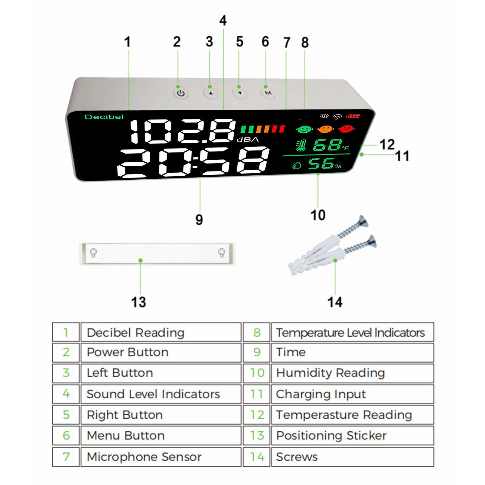 2. [4 в 1 метр] Завдяки цьому метру ви отримаєте вимірювач шуму, термометр, гігрометр та годинник, які забезпечать комфорт на роботі та житті. Розроблений з 11-дюймовим світлодіодним екраном, яскравість регулюється.