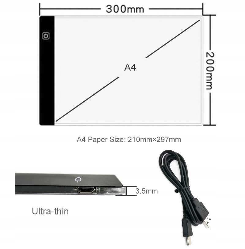 Освітлена дошка для малювання призначена для підготовки ескізів та малюнків на вуглецю та папері. Дошка надзвичайно тонка і яскрава з форматом A4. Працює з USB -кабелем DC 5 V (кабель у наборі).