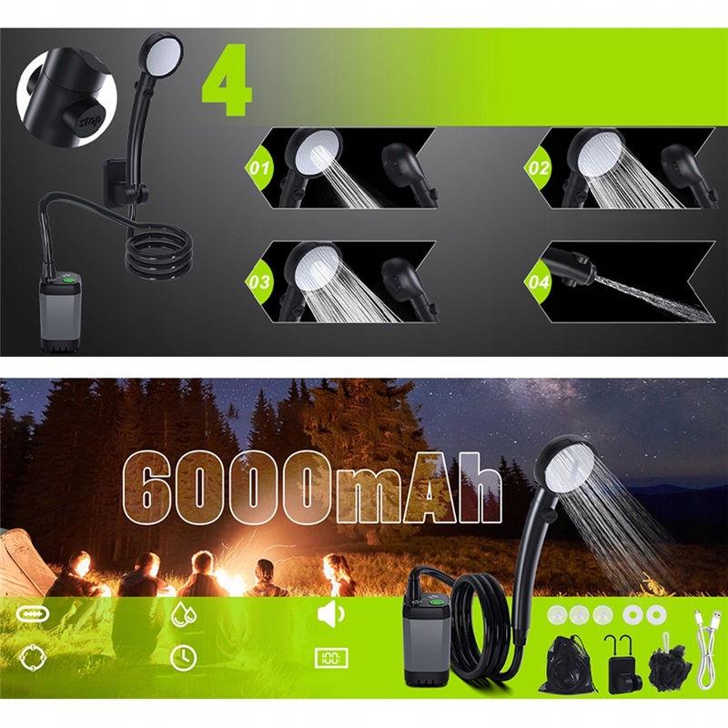 ✅ 【чотири режими дозування води】: портативний душ кемпінгу має чотири зручні режими дозування, які можна перемикати між різними режимами для задоволення потреб різних ситуацій. Ви також можете вибрати один із двох режимів швидкості для регулювання потоку води до ваших потреб. Крім того, модернізований двигун працює тихо і забезпечує спокійне середовище для душу в кемпінгу.