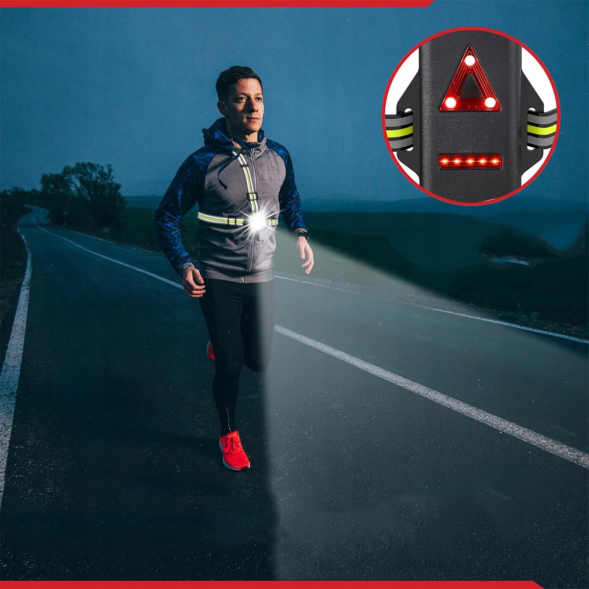 Створений для більшості ранкових пробіжок, наш біговий ліхтар має регульований еластичний ремінь, який забезпечує зручну посадку для різних типів фігури. Світловідбиваючі смуги забезпечують додатковий захист із білим світлом спереду та червоним попереджувальним світлом ззаду, оскільки вони не лише покращують видимість для зустрічного транспорту, але й допомагають помітити небезпеки на дорогах і стежках.