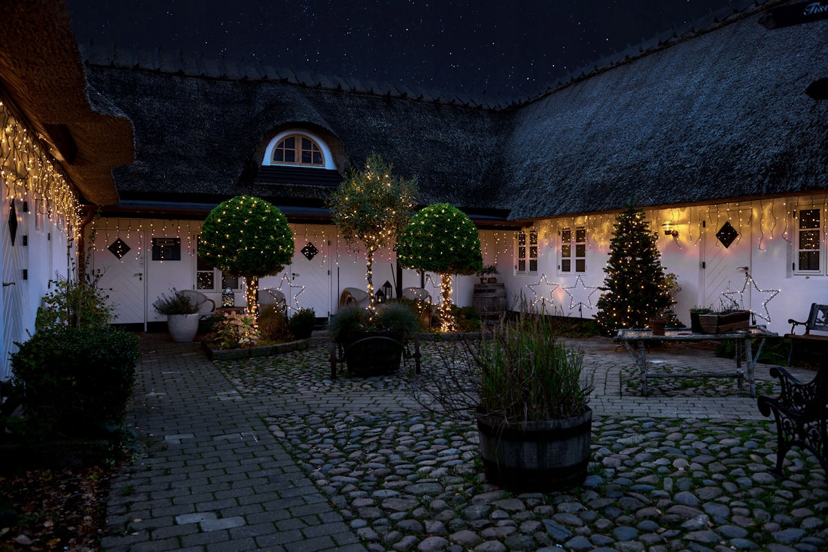 За допомогою цієї світлової завіси можна сучасно облаштувати дахи, фасади, балкони, тераси та інші елементи. Завіса з крижаним дощем — це чудово гнучкий різдвяний вогник.