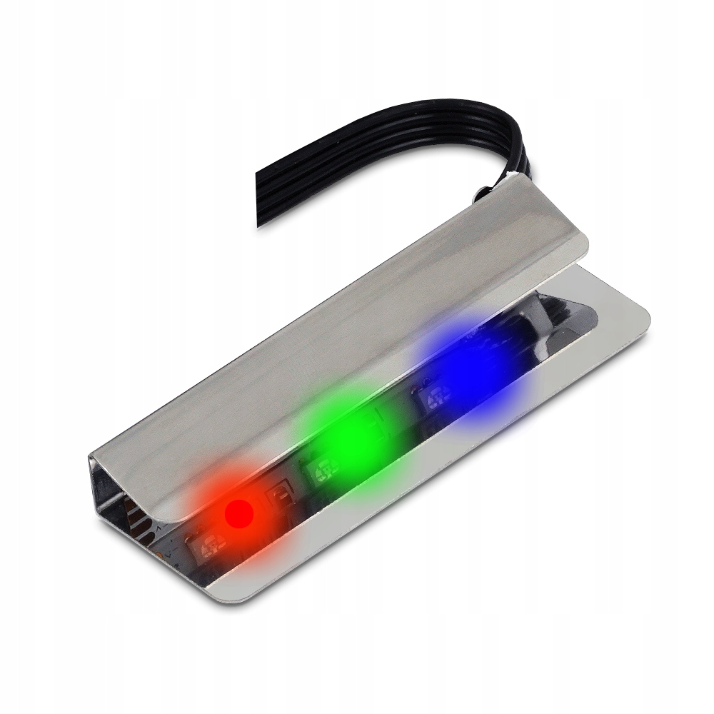 Кліп з встановленими світлодіодами SMD RGB, призначеними для 12 В. Кліп виготовлений з металу. Для кліпу встановлено 2 м живлення, закінчений міні-4-контактним RGB Plug. скляної полиці. Після включення потужності полиця висвітлюється та її переднього краю. Для набору 2, 3 або 4 бали - готові до з'єднання, що містить кліпи, джерело живлення та контролер RGB з пультом дистанційного керування.