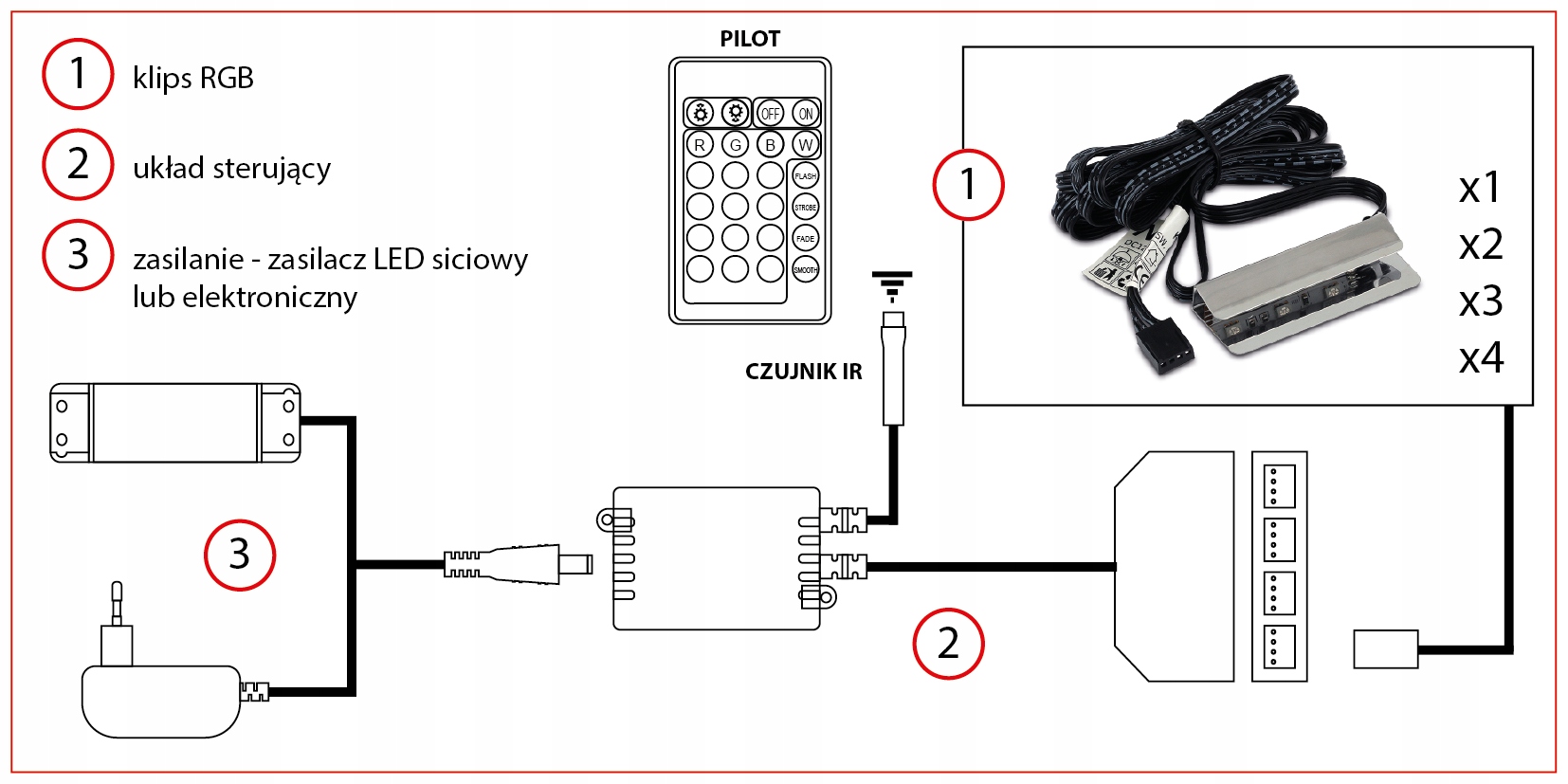 Ми постачаємо кліпи напругою 12 В, тому для правильної установки встановлення ми повинні використовувати джерело живлення 12В. Для того, щоб кліп працював правильно, використовуйте контролер RGB. Схема такого набору представлена нижче.