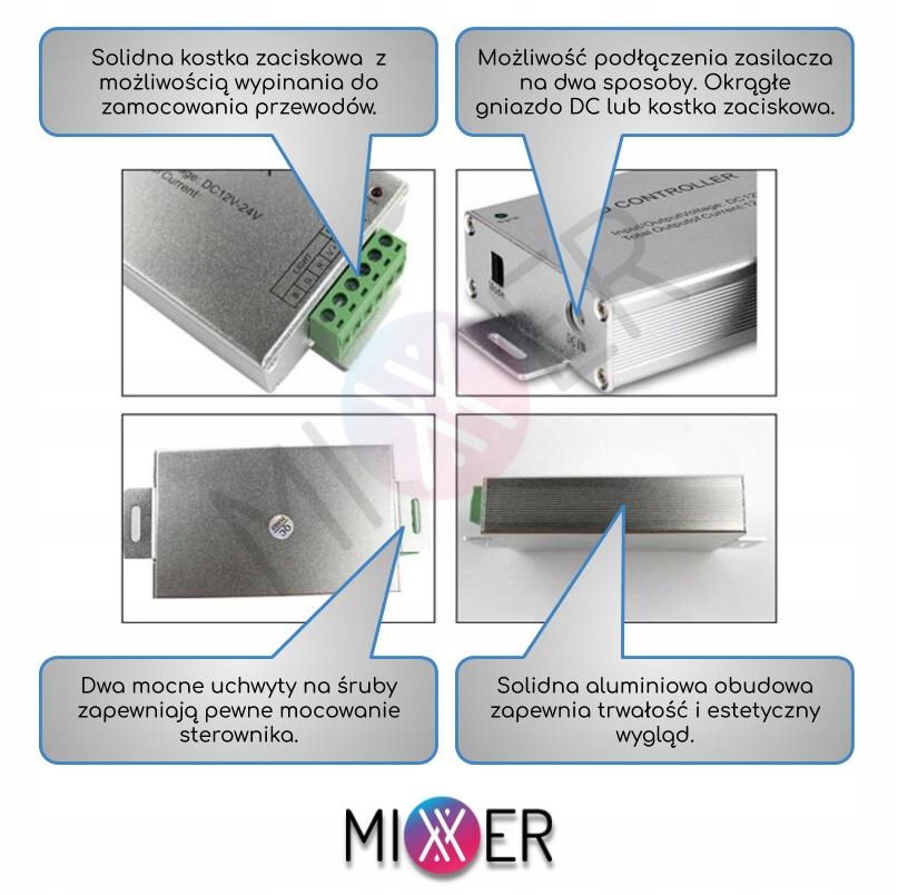 - Блок живлення: затискач або розетка 2,1/5,5 (при більш високих навантаженнях ми рекомендуємо використовувати штепсельну вилку)