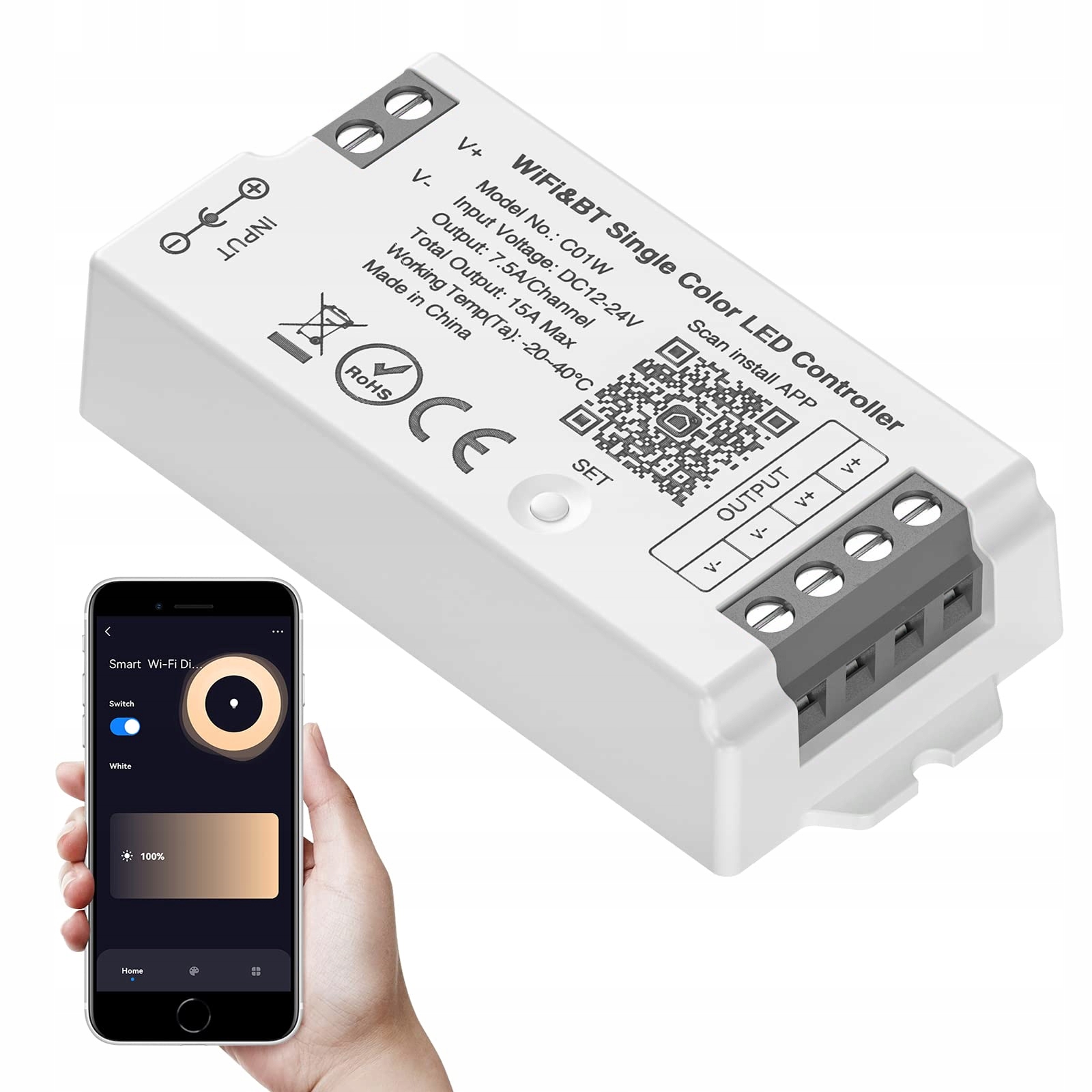 SEZO C01W одноколірний світлодіодний контролер із Wi-Fi та Bluetooth, групове керування, сумісний із додатком Alexa, Google Home/Tuya Smart Life, працює з LM091, LM096, LM007, LM097 WR02RF, пультом дистанційного керування DC12-24V