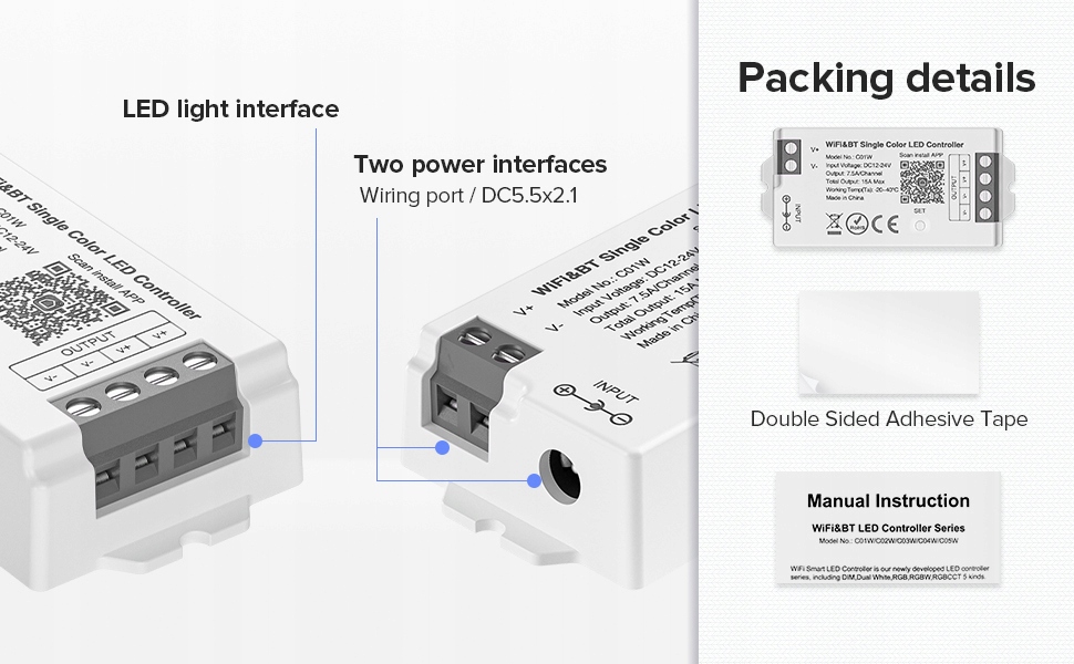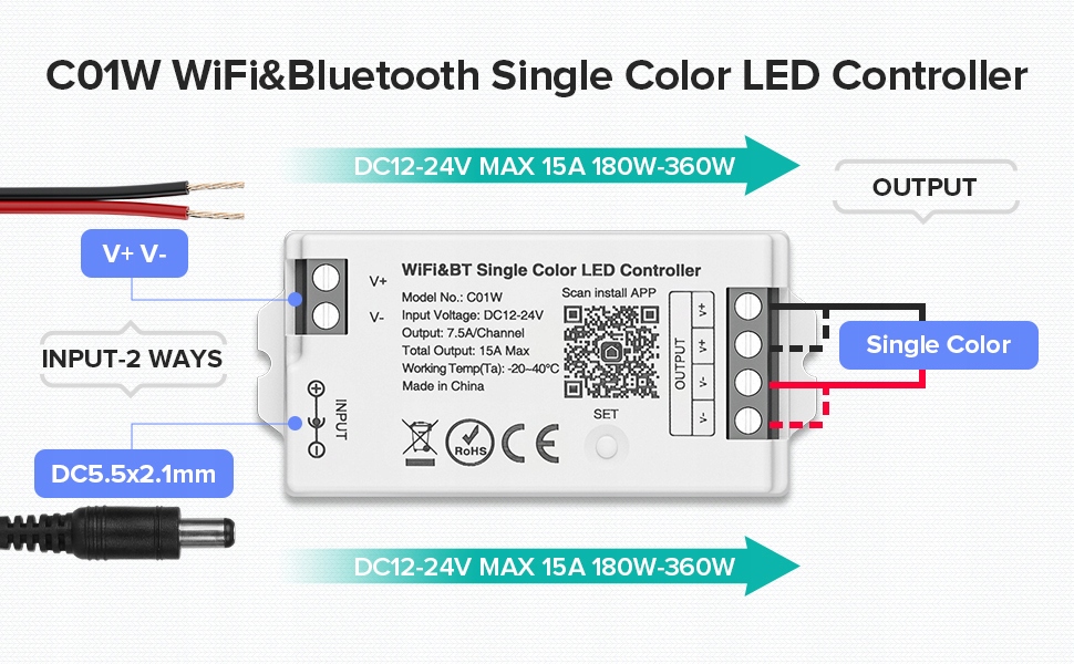 - [WiFi Dim LED Controller] Цей контролер підходить для V+V-2 дроту зі світлодіодними стрічками, такими як FCOB 2835 5630 5730 5050 3014 тощо. Вхідна напруга: DC12-24V, вхідна напруга має бути такою самою, як робоча напруга стрічки; Ємність: 7,5 А/канал; Загальний 15A Макс. Коли маршрутизатор WiFi від’єднано, керування з’єднанням Bluetooth можна використовувати як резервний метод керування.