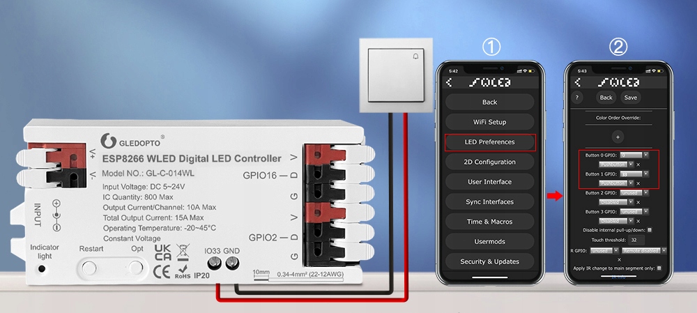 Контролер оснащений інтерфейсом GPIO14, що дозволяє підключити кнопки або комутатори.