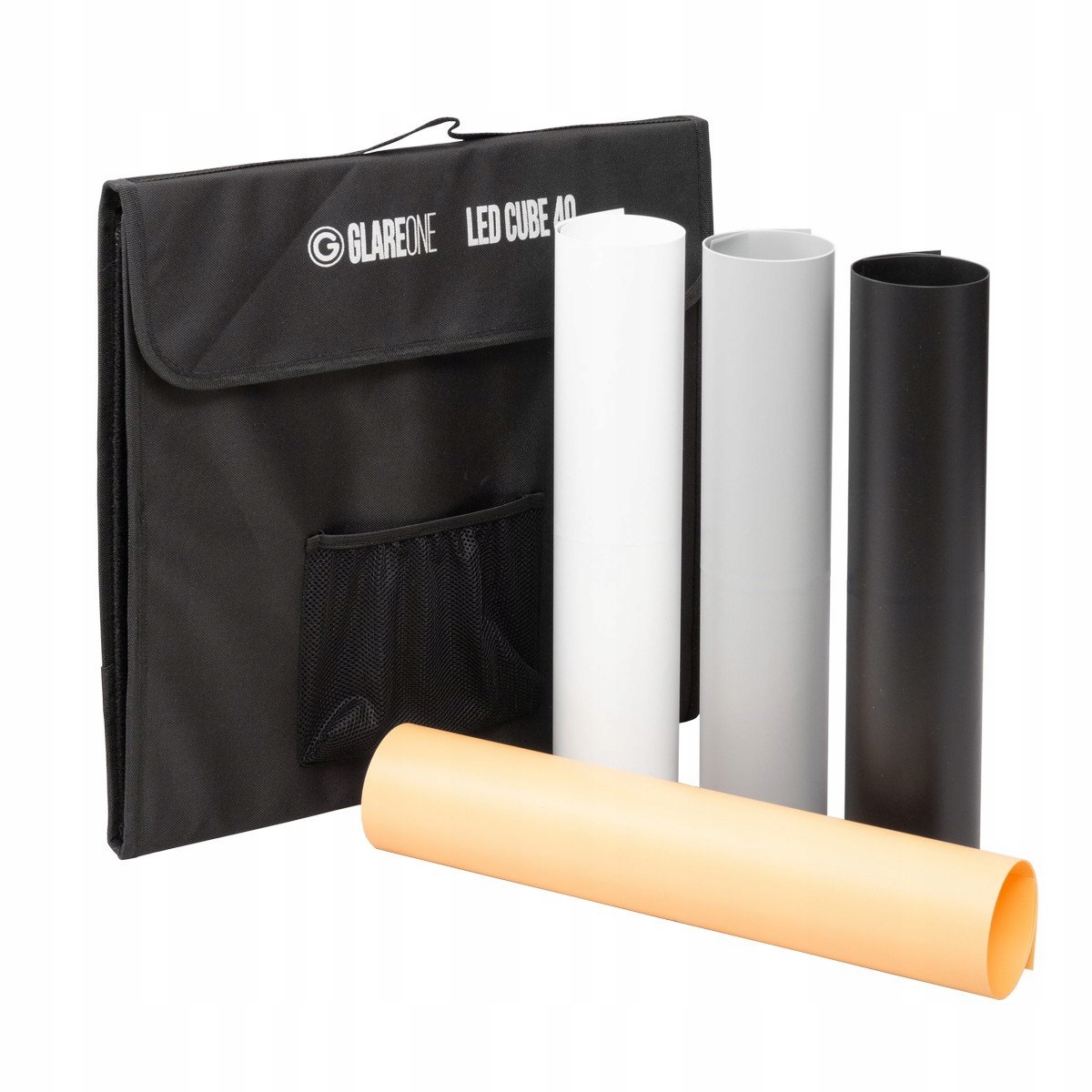 4 Інтер'єр покритий світлом, що відображає срібний екран, який робить сфотографований об’єкт рівномірно освітлений з кожного боку. Фон, що постачаються в наборі, виготовлені з акрилу, завдяки якому вони міцні, прості в магазині та водонепроникність, а їх встановлення всередині світлодіодного куба відбувається з липучкою. Набір також включає білий дифузор, який, якщо необхідно, може бути встановлений нижче джерел світла, щоб додатково розсіяний і пом'якшити.Особливості продукту: