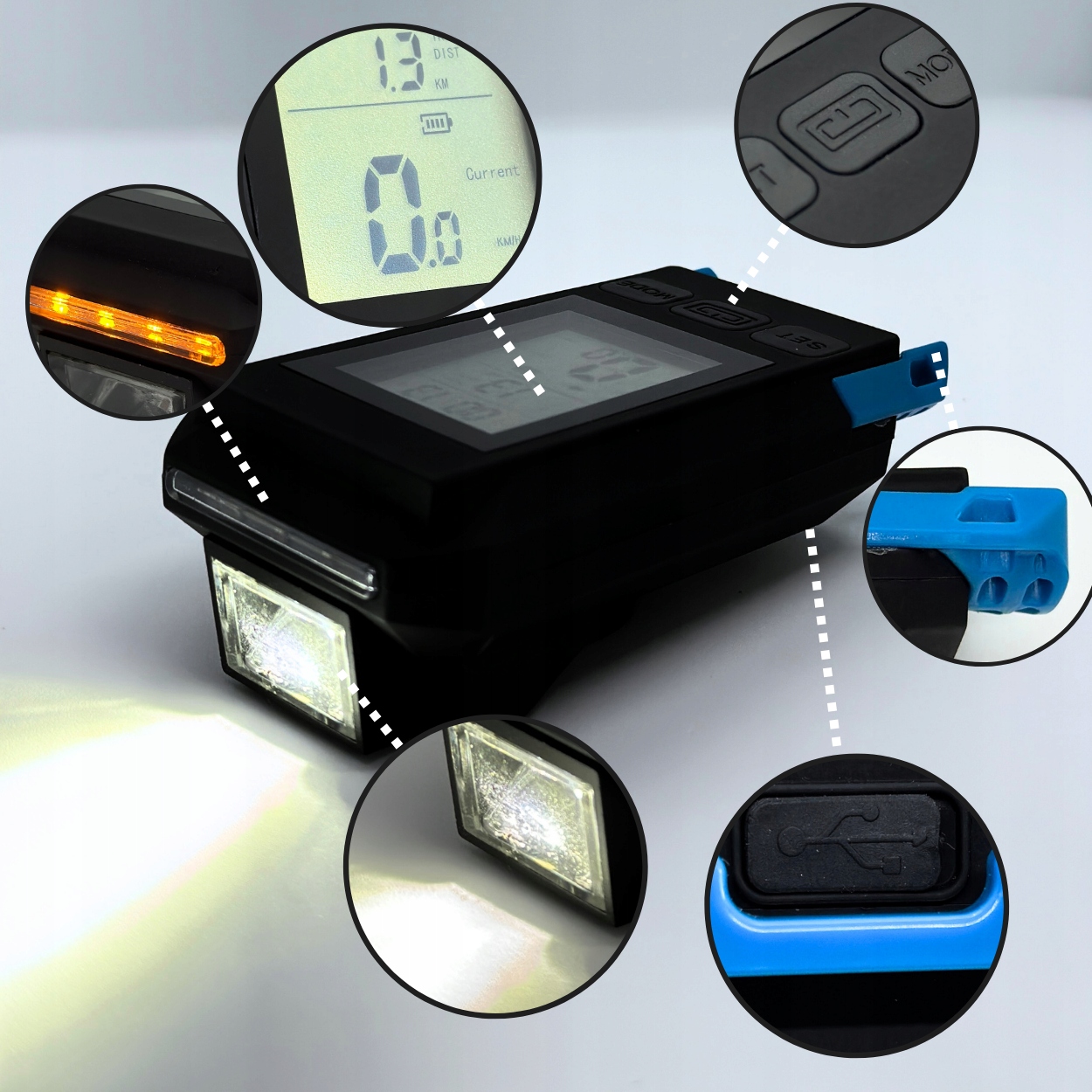 ЛІЧИЛЬНИК - Лампа оснащена дисплеєм, на якому ми можемо перевірити всю найважливішу інформацію про нашу подорож. Наприклад: швидкість, час, пройдена відстань, година, температура, кількість калорій, найвища швидкість, середня швидкість, загальний час тощо.