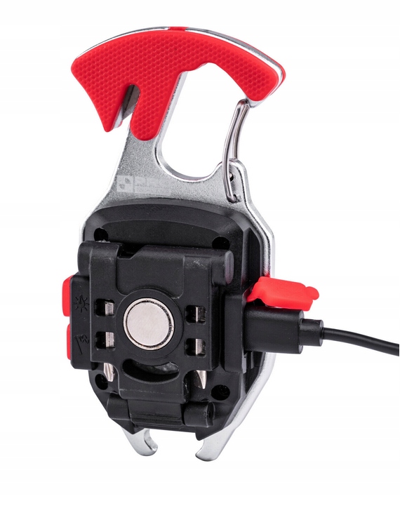 Універсальний і багатофункціональний ліхтарик-брелок зі світлодіодами COB, виготовлений із комбінації міцного АБС-пластику та алюмінію, живиться від літій-полімерної батареї 3,7 В 400 мАг. Має стандарт герметичності IPX4, що робить його стійким до бризок води з різних напрямків з інтенсивністю до 10 літрів на хвилину. Крім того, ліхтарик відповідає класу IK04, що робить його стійким до ударів з енергією 0,50 Дж. Регульована на 160 градусів підстава має вбудований потужний магніт, світлодіодний індикатор живлення та світлодіодний індикатор зарядки, а також відрізок ременя безпеки. Вбудований гачок з пружинним механізмом дозволяє швидко і зручно прикріпити ліхтарик.