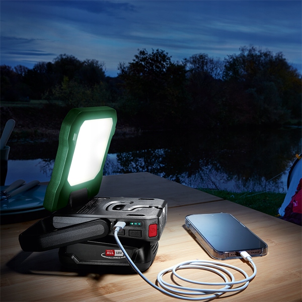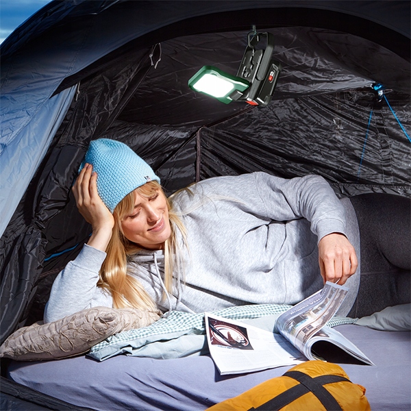 EasySpotLight 18V-400 є ідеальним рішенням для кемпінгу, обіду на відкритому повітрі або домашньої справи. Лампа пропонує світловий потік до 400 люмен, трирівневе налаштування яскравості та колірної температури (тепле/холодне світло) і може бути швидко адаптована до потреб конкретного завдання чи настрою, якого ми хочемо досягти. Його легко носити і зручно тримати завдяки ручці і універсальному дизайну, також він має потужні магніти і гачок для кріплення. Рухливу головку можна нахиляти до 180° і обертати до 360°, щоб забезпечити точне освітлення потрібної області. Світлодіодна лампа також служить додатковим акумулятором USB-C©, тому ви можете використовувати її для зарядки смартфонів та інших пристроїв. Інструмент є частиною системи 18V POWER FOR ALL. Можливість використання одного акумулятора для всіх електроінструментів 18V POWER FOR ALL.