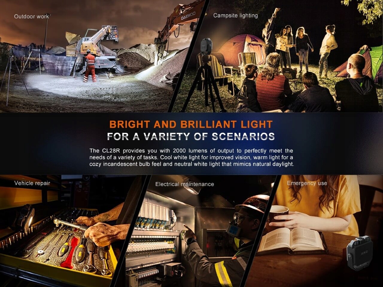 Зовнішня лампа Fenix CL28R - це перша модель освітлення Fenix, яка дозволяє плавно змінювати кольорову температуру світла в діапазоні від 2700 до 6000 K . Лампа випромінює біле світло з потоком 2000 люмен та кутом 160 °, корисним для освітлення широкого етапу, робочого місця чи кемпінгу. Компактна форма, можливість фіксації кількома способами та місткою акумулятор 10 000 мАг зробити галоген Fenix cl28r ефективно заповнює проміжок між лампою табору та промисловим галогеном. Будівництво
