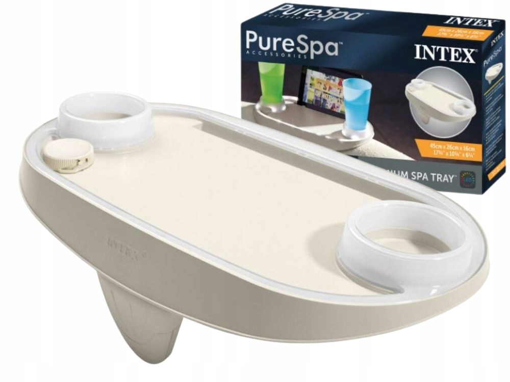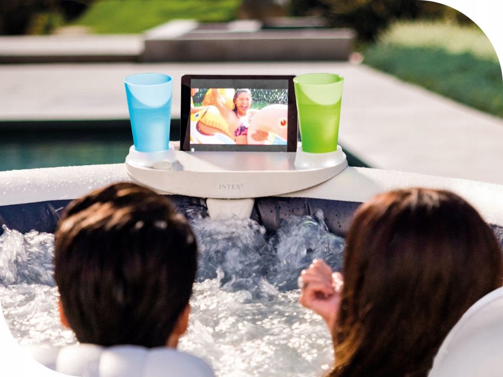 Піднос бренду Intex створений для ще більшого комфорту використання домашнього SPA. Ви можете спокійно потягнути улюблений напій або перекусити, не виходячи з басейну. Вбудована підставка для планшета/мобільного телефону дозволяє дивитися відео без рук. Він оснащений білою світлодіодною стрічкою, яка забезпечує атмосферне освітлення під час використання SPA. Піддон стійкий і міцний - його можна безпечно прикріпити до стіни джакузі.