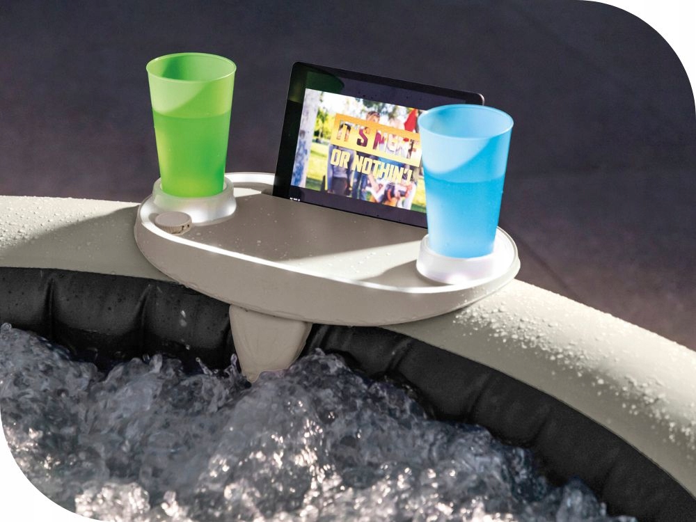 Піднос бренду Intex створений для ще більшого комфорту використання домашнього SPA. Ви можете спокійно потягнути улюблений напій або перекусити, не виходячи з басейну. Вбудована підставка для планшета/мобільного телефону дозволяє дивитися відео без рук. Він оснащений білою світлодіодною стрічкою, яка забезпечує атмосферне освітлення під час використання SPA. Піддон стійкий і міцний - його можна безпечно прикріпити до стіни джакузі.