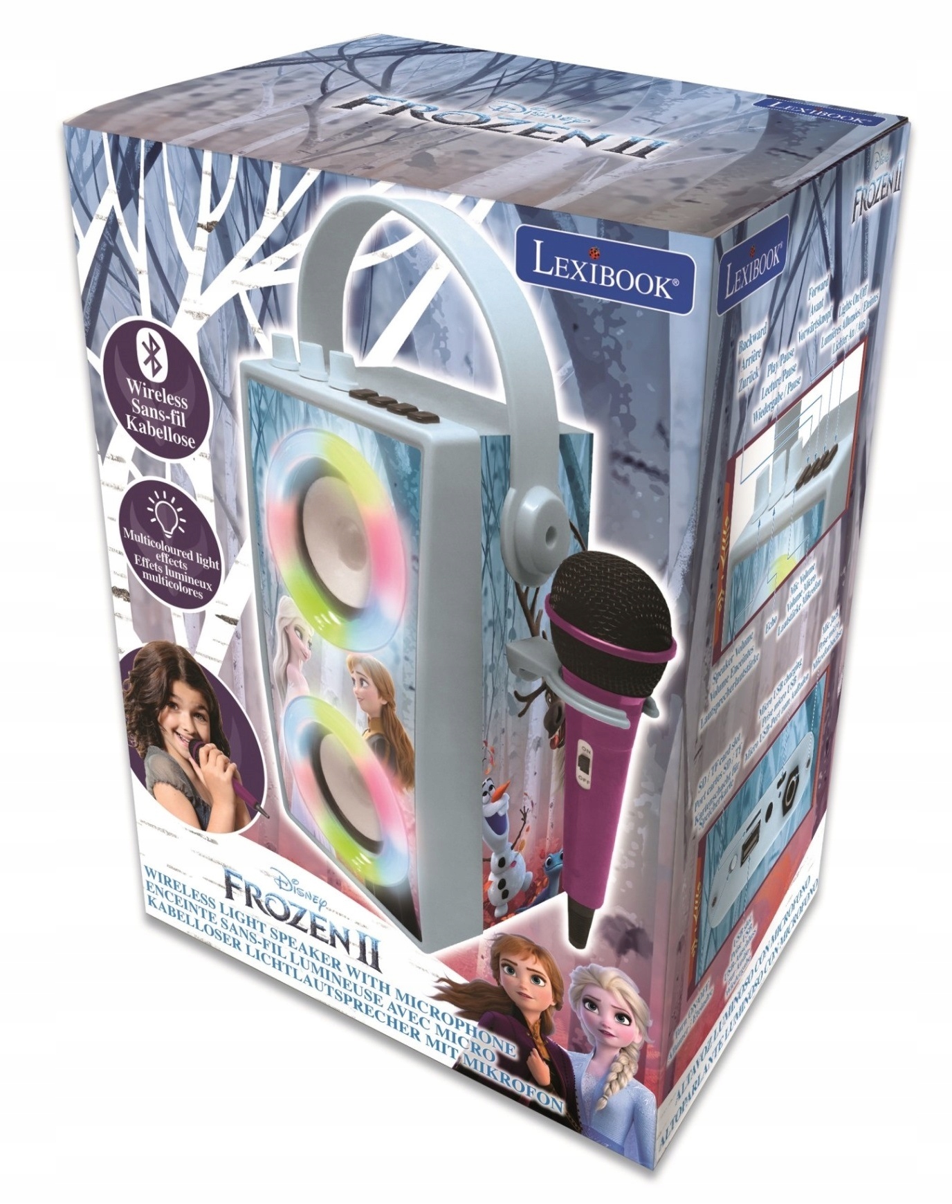 Співайте улюблені пісні із серіалу "Крижане серце". Співайте як зірка зі справжнім мікрофоном і використовуйте різнокольорові світлодіодні лампочки, щоб створити дивовижну атмосферу. Вбудовані акумулятори забезпечать довгі години задоволення. Легка і портативна конструкція дозволяє брати обладнання для караоке куди завгодно. Це буде ідеальний подарунок на день народження вашої дитини!