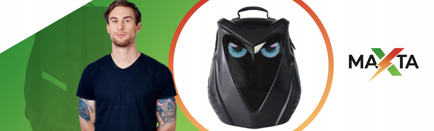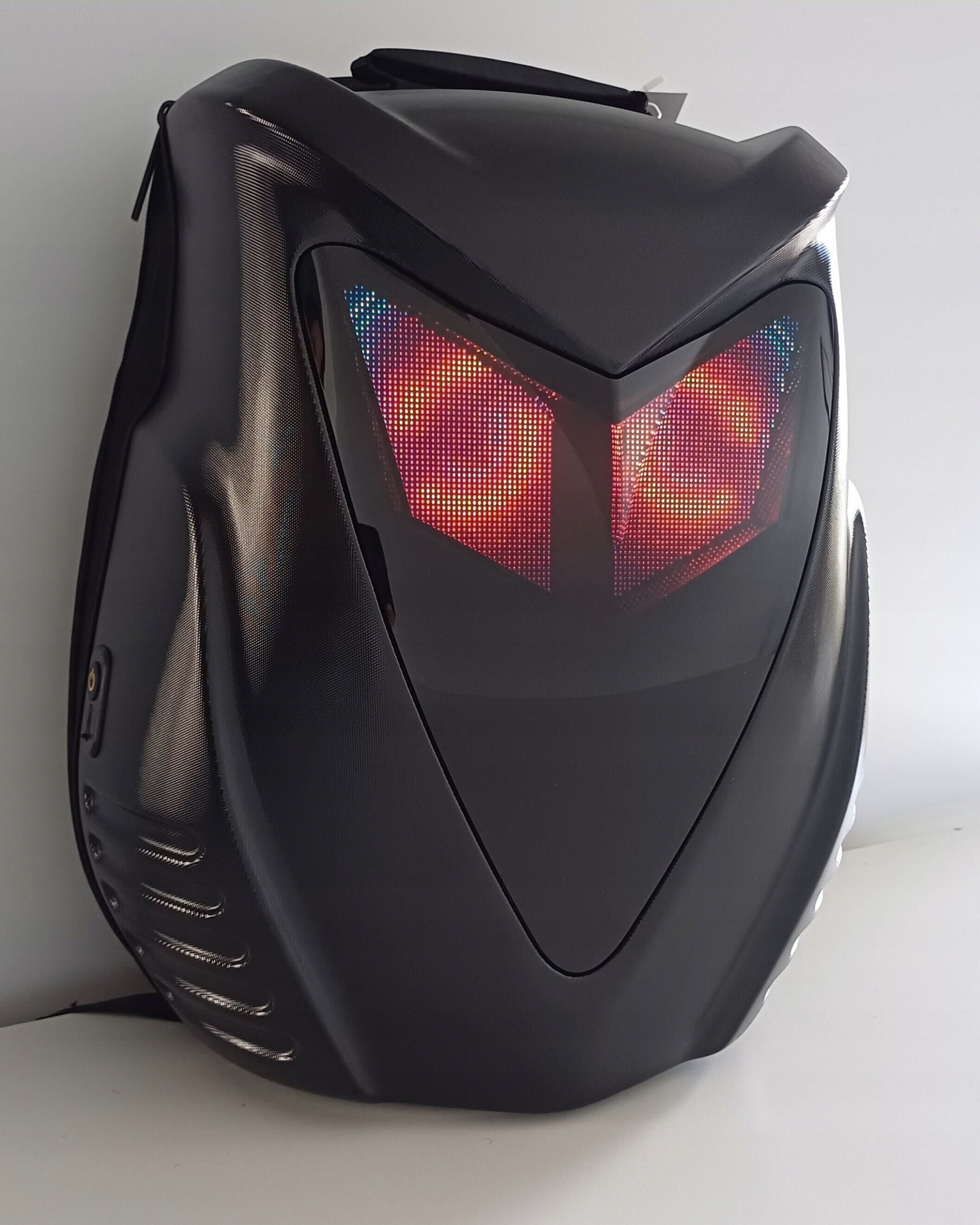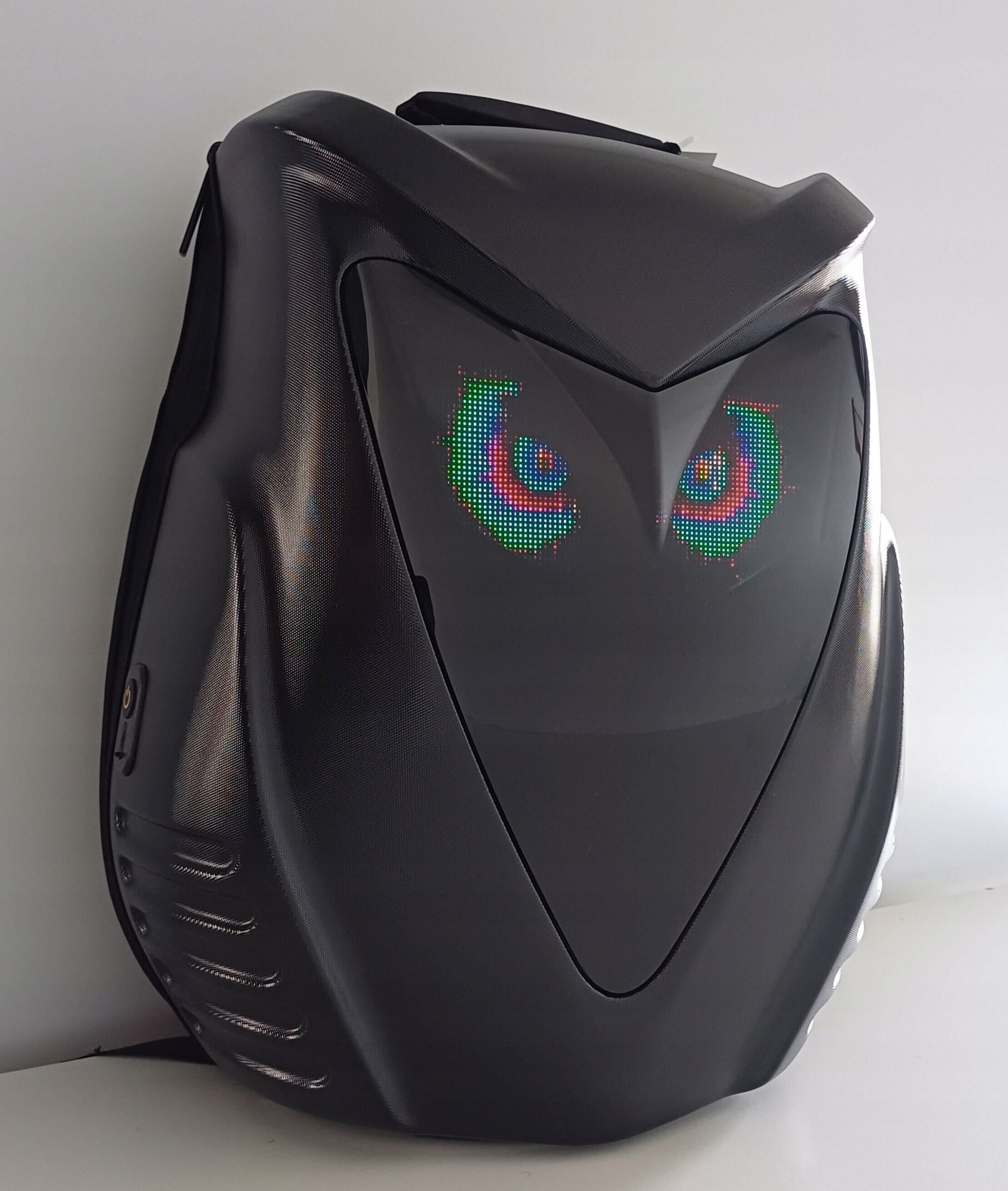 Чорний нічний рюкзак із світлодіодним дисплеєм дозволяє відображати зображення та анімації через виділений мобільний додаток loy Eyes . Пристрій вимагає зовнішнього джерела живлення, наприклад PowerBank.