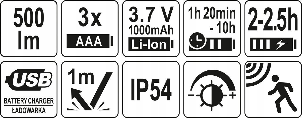 ФАРА 500LM, БАТАРЕЯ/3XAAA, ДАТЧИК РУХУ, LI-ION 3.7V 1000MAH, IP54, ПОСТІЙНЕ РЕГУЛЮВАННЯ СВІТЛА