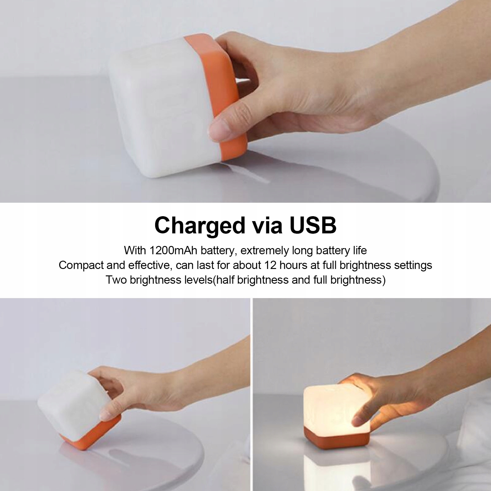 3. Зручний і гнучкий: він оснащений акумулятором ємністю 1200 мАг, що забезпечує надзвичайно тривалий час автономної роботи. Можна заряджати через USB. Після повної зарядки його можна використовувати тривалий час без необхідності частої зарядки. Нічник компактний і ефективний і може працювати приблизно 12 годин на повній яскравості (якщо ви вирішите зменшити яскравість до половини, вона може працювати навіть довше). Фліп-освітлення дуже підходить для використання вночі, що позбавляє від проблем, пов’язаних з нічним обмацуванням. Якщо ви хочете світити всю ніч, ви також можете підключити